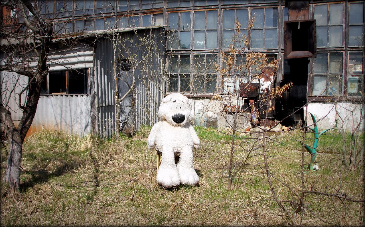 Когда возвращались назад из храма увидели большого плюшевого медведя, сидящего на стуле. Захотелось подойти поближе и сфотографировать. Вечером или ночью в сторону заброшенного цеха мы бы точно не пошли.