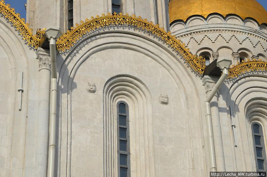 Сам собор бесспорно красив, но резьба , покрывающая его еще сверху до низу, просто великолепна! Более 1000 резных камней! Ученые подсчитали, что на создание каменных фигур в церкви Покрова на Нерли потребовалось три с половиной тысячи человеко-дня. Но там ведь количество камней существенно меньше.