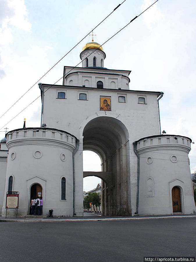 На мой взгляд, с этой площадки открывается самый удачный вид на Успенский собор, да и на окрестности города в общем. Наконец-то мы увидели Клязьму и, как мы поняли, основной мост через речку. А я, как любитель ж/д, полюбовалась путями и товарными составами. Хотелось бы отметить, что это излюбленное место не только туристов, но и местных жителей. Народа было достаточно: кто-то гулял с детьми, молодежь компаниями сидела на газонах, туристы фотографировали.Передохнув немного на газоне, мы отправились дальше — к Золотым воротам.