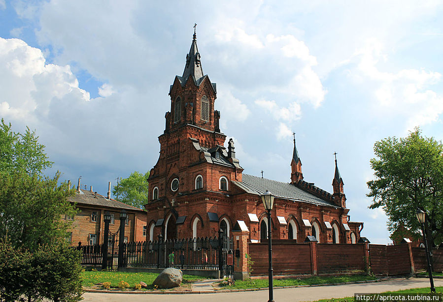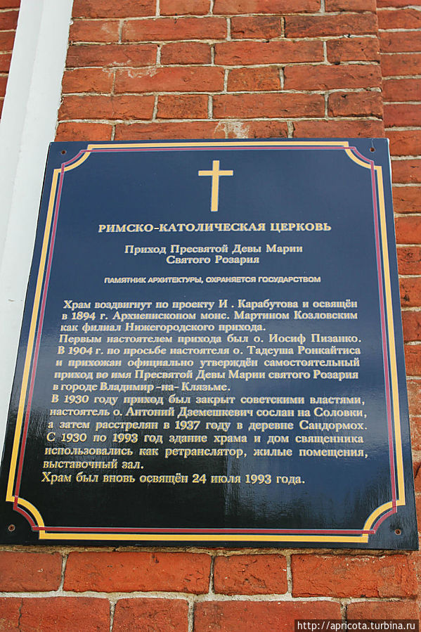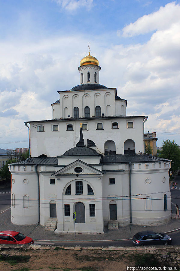 Владимир знаменит тем, что находится на 9 холмах. Как раз Золотые ворота можно рассмотреть не только с Большой Московской, но и немного сверху, с небольшого холма. С этого холма также открывается вид на Троицкую церковь или церковь старообрядцев. Эта церковь была построена в 1913–1916 годах к 300-летию императорского Дома Романовых на средства купцов-старообрядцев. Их влияние в городе было столь сильным, что им разрешили построить Троицкую церковь в самом центре города, рядом с Золотыми Воротами. Сами владимирцы называют ее «Красная церковь». Рядом с ней располагается Театральная площадь с Академическим театром драмы. Если пройти немного в сторону, то можно увидеть бывшую водонапорную башню, в которой сейчас проходит выставка "Старый Владимир", а сверху есть смотровая площадка. К сожалению, в этот день башня была закрыта, и нам не удалось попасть еще на одну смотровую площадку. Зато если обойти башню, то можно увидеть Успенский собор с другого ракурса.Здесь же, рядом с Театральной площадью расположился костел св. Розария Пречистой Девы Марии. Костел не очень большой, но достаточно уютный. Когда мы подошли к нему, резко начался дождик и мы спрятались от него внутри костела.