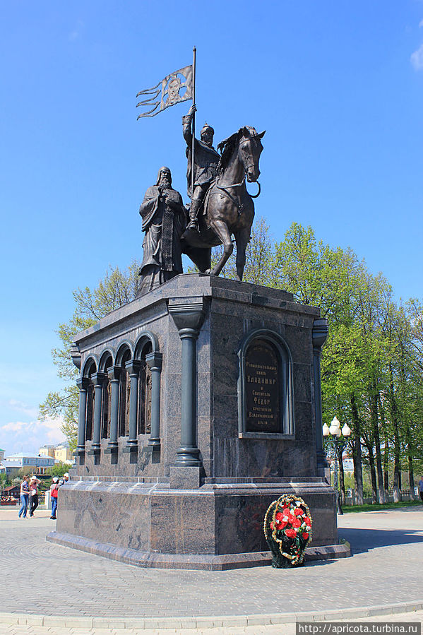 Немного неприметным на площади смотрится памятник Андрею Рублеву. Соборная площадь также привлекает своим необычным, по сравнению с остальными, зданиеми из красного кирпича. Это здание бывшей городской думы. С Соборной площади также открывается дорога в небольшой парк "Пушкина" ("Пушкарь"), раскинувшийся возле Успенского Собора. В жаркий летний денек здесь приятно скрыться в тени деревьев, но как всегда возникает проблема — нехватка лавочек.Прогулявшись вдоль парка, мы оказались на еще одной смотровой площадки, на которой находится величественный памятник князю Владимиру Красное Солнышко.