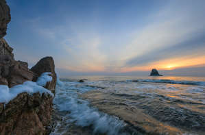 Следующее утро у нас началось рано. Надо было не только встать, привести себя в «рабочее» состояние, позавтракать, но и добраться до места съемки еще затемно. А езда ночью по резко пересеченной местности- то еще удовольствие! Но как бы то ни было, к рассвету мы добрались до арки. Как уже стало доброй, зимней традицией, мы взяли с собой «ползунки», чтобы попытаться поснимать арку со стороны моря. И если Валера быстренько запрыгнув в данный продукт резино-технической промышленности, скрылся в прибрежной траве, то мне стоило титанических усилий заставить себя залезть в комбинезон. Так не охота было лезть в воду…