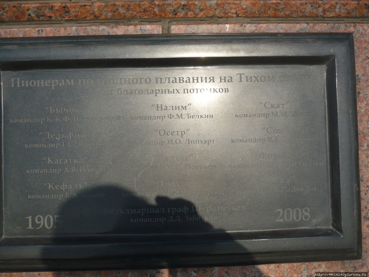 На памятной доске выбиты наименования первых подводных лодок на Тихом океане и их командиров: «Бычок», «Дельфин», «Касатка», «Кефаль», «Налим», «Осетр», «Палтус», «Плотва», «Скат», «Сом», «Форель», «Щука» и «Фельдмаршал граф Шереметьев».