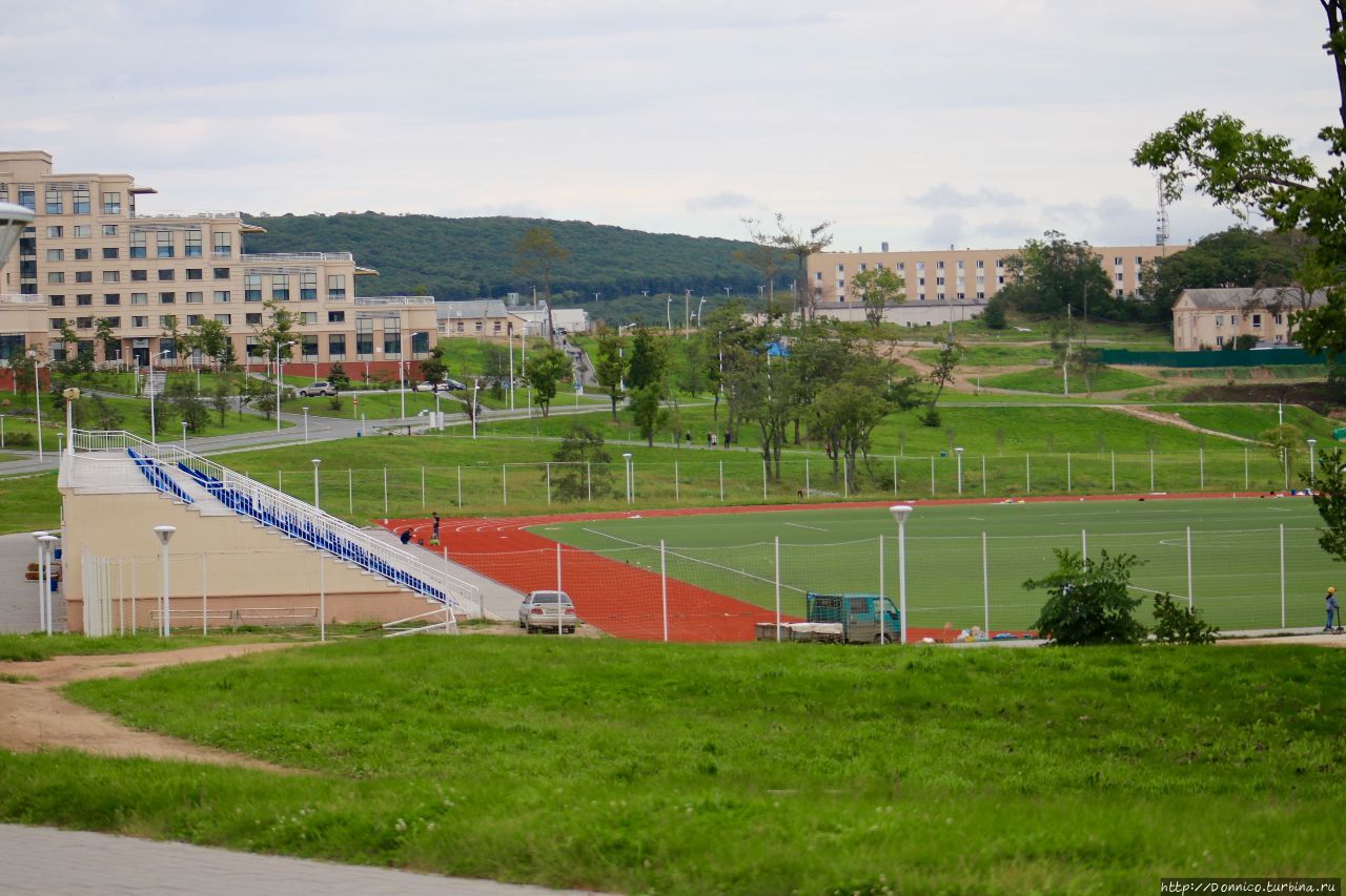 Мы с Женей заметили множество курсирующих по городку автобусиков. Скорее всего они делают внутри несколько остановок и также связывают университетский город с центром Владивостока. У ДВФУ есть здания факультетов и помещения также в центре, поэтому решать проблему логистики так или иначе нужно.