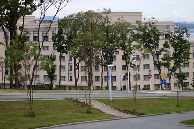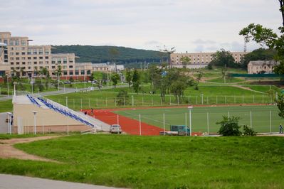 Было заметно, что этот основанный еще в 19 веке университет, после прошедшей крупной реорганизации, еще только начинает искать свой новый путь в этом мире. С учетом того, сколько университетов построил в последние годы Китай, ДВФУ придется конкурировать за международных студентов именно с ними. Поживем-увидим... А пока на отъезде мы увидели марширующую около кампуса роту МЧС. Видимо где-то рядом с кампусом на острове Русском находится их база.