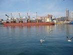 На берегах огромное количество портовых кранов, обслуживающих морской торговый порт, протянувшийся на 3 километра вдоль береговой линии.