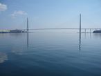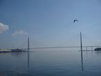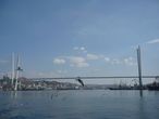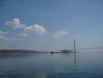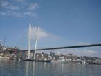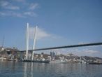 Перед нами предстает во всей красе Русский мост. Открыт тоже в 2012 году, это второй по высоте мост в мире, его высота составляет 324 метра. Имеет самый большой в мире пролет среди вантовых мостов – 1104 метра. Мост связал материковую часть Владивостока с островом Русский.