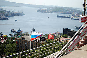 В один из подъемов на нее был сделан этот кадр Лично мне он нравится даже не за вид на вход в бухту Золотой Рог, а за эти три флага. По-моему, это точно про Владивосток — мы чтим свою историю (или точнее еще учимся), мы смотрим в будущее вместе с новой Россией и мы все-таки авантюристы-флибустьеры в душе