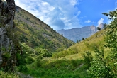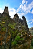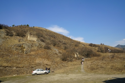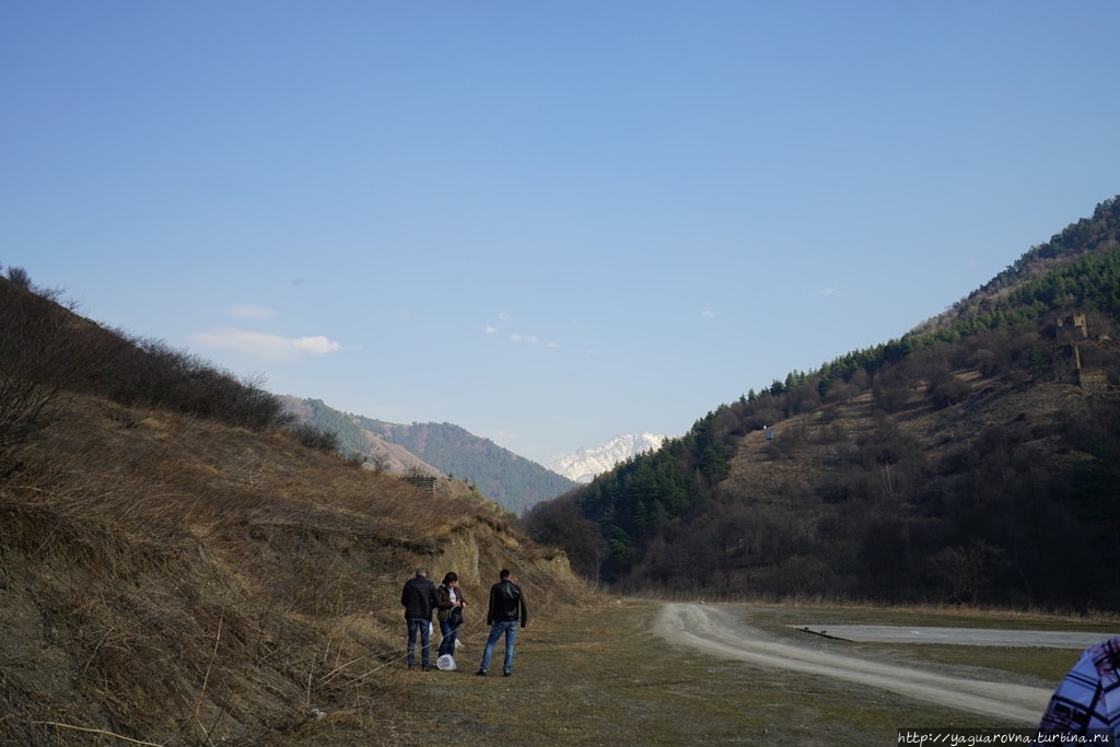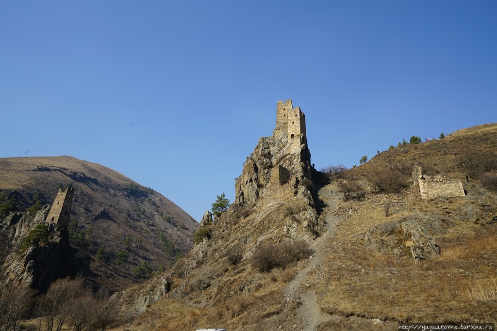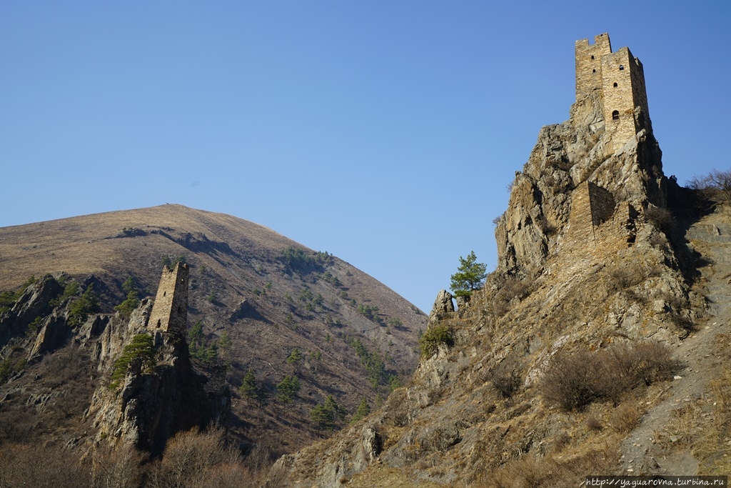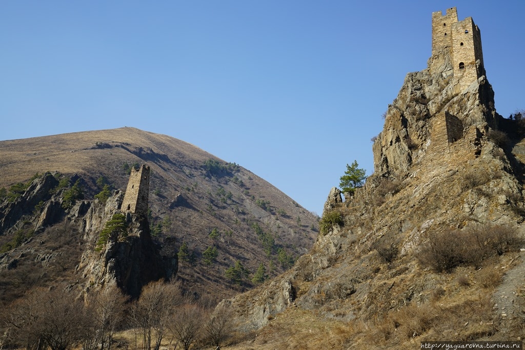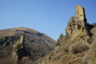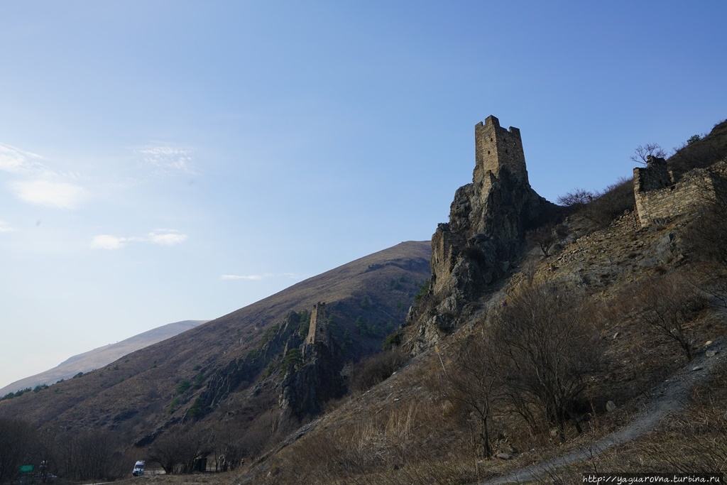 Уцелевшие очертания башен словно вырастали из валунов на склонах гор Гулойхийского ущелья. Комплекс состоит из двух отдельных неприступных замков, соединявшихся в древности подвесным мостиком. В переводе с ингушского Вовнушки означают «место боевых башен». Сегодня требуется напрячь воображение, чтобы представить эти боевые башни в их первоначальном виде. Они были четырехъярусные, с узкими бойницами, высоким парапетом и плоской крышей. Они наглядно иллюстрируют понятие «твердыня»: огромные каменные сооружения, твердо стоящие на скальном основании. Подступы к башням и жилым пристройкам преграждали мощные крепостные стены, которые поначалу воспринимались как естественная часть горы. После возвращения домой я прочитала, что недалеко от башен сохранился редкий для края ядрообразный мавзолей. Поскольку заранее об этом месте практически ничего не знала, то и попыток полазить по склонам или попытаться поподробнее расспросить гида не довелось. Впрочем, подняться повыше я все-таки попыталась, но быстро сдалась: тропинка есть, но склон очень крутой и я побоялась в прогулочных тапочках не столько тяжелого подьема, сколько непркдсказуемого спуска... Если соберетесь сюда — подберите удобную обувь.