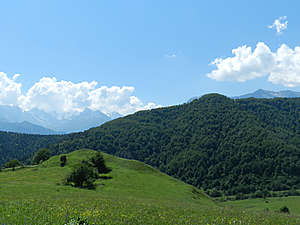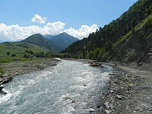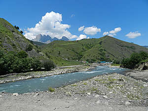Проезжаем мимо погранзаставы. Дальше нашей спутницей становится Гулой-хи – основной приток Ассы. Слева по течению Гулой-хи горы покрыты хвойным лесом, тогда как правые склоны во власти цветов и травы.