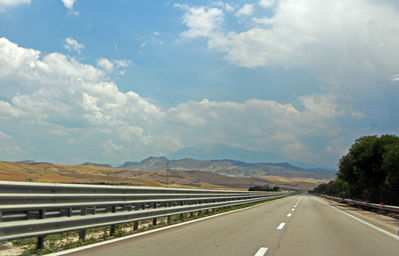 Вообще говоря, любой отель на Сицилии предлагает однодневную экскурсию, не дешевую, но это безусловно самый простой способ посещения. У меня-же была аредованна машина на все две недели отдыха, потому я решил добраться туда самостоятельно (по дороге посетив еще один очень интересный объект из списка ЮНЕСКО). Этна возвышается над островом более чем на 3000 метров, потому ее очень хорошо видать из многих мест, вот например с трассы Палермо-Катания