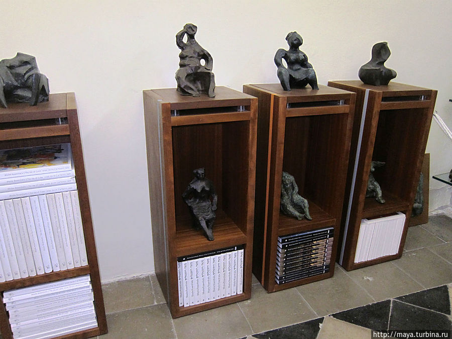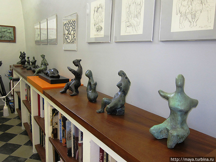 Хотя картины не были главной целью, я , конечно, обратила на них внимание. Особенно поразил резкий контраст между картинами до и после. "До" — это Литовский период, когда прошедший войну и художественное училище художник рисовал картины в духе социалистического реализма ( мне нравится, а вам?). А в 50-х, переехав в Израиль, Моше резко поменял стиль. Вот эти картины и сделали его знаменитым. Захотелось заглянуть в кабинет. Там очень интересный потолок. Хотелось заглянуть потихонечку, но оказалось, что можно не подглядывать, а просто войти. Там выставлены работы скульптора Дуди Галя. И можно зайти и все их посмотреть.