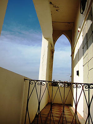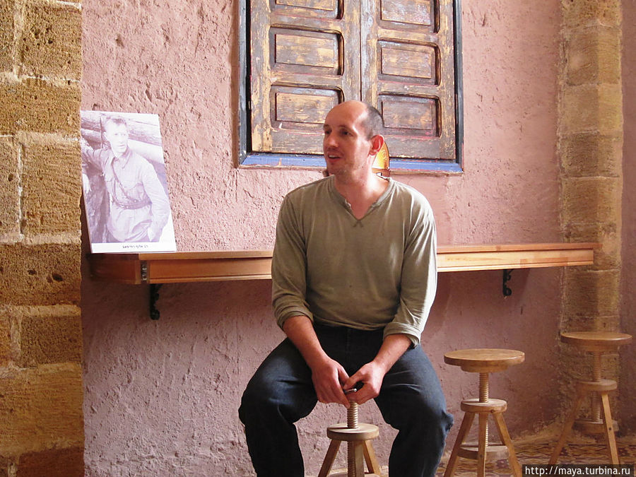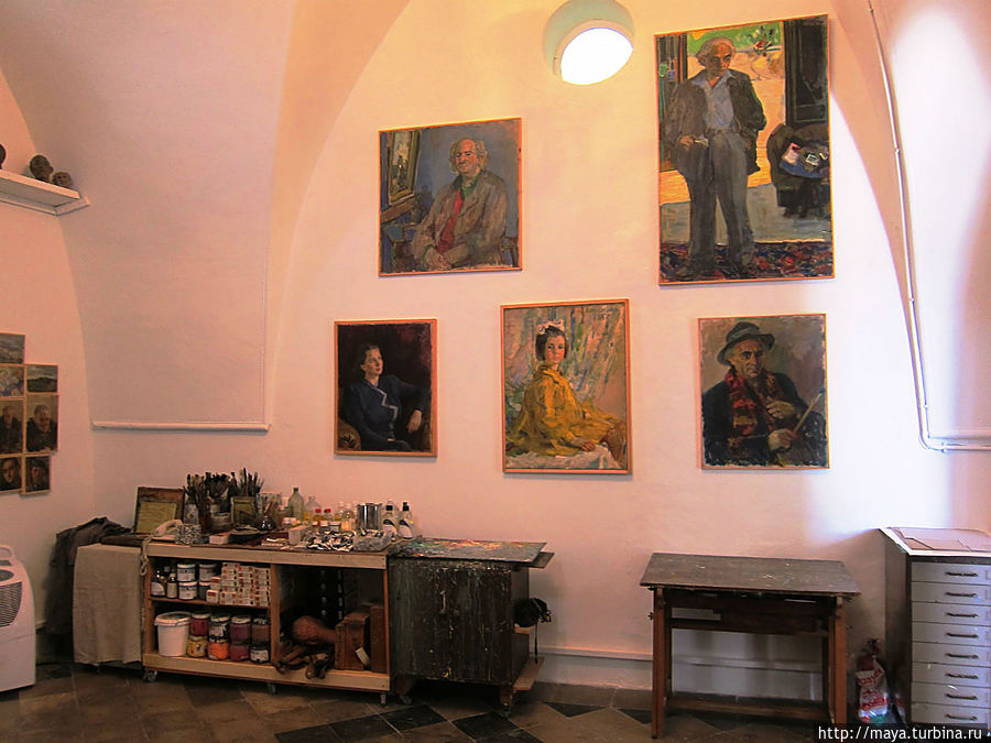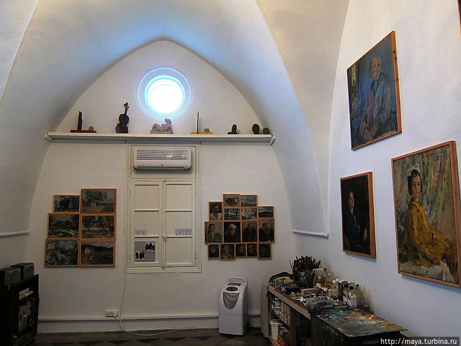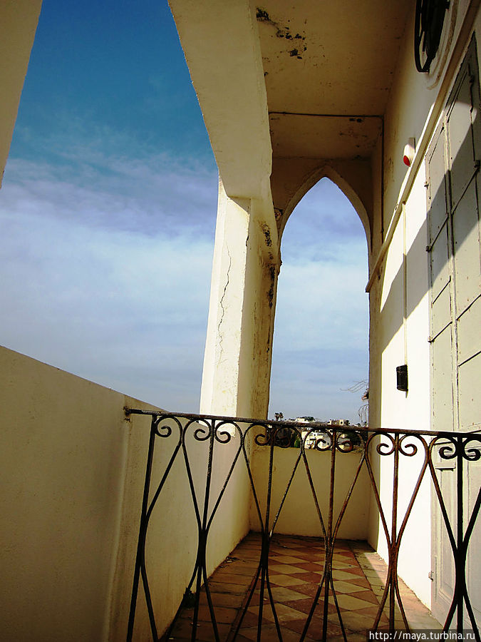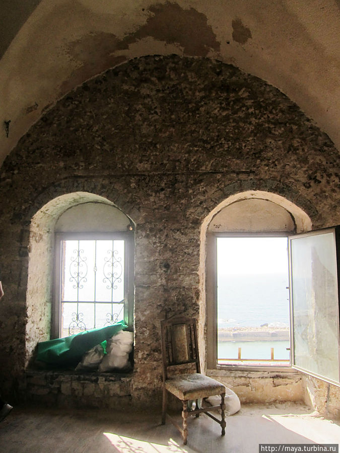 Вот это красивое белое здание, нависающее над портом. Чтобы попасть в дом, надо подняться по узкой и длинной лестнице и выйти на террасу. С дальней стороны сквозь арку видно море и вид с этой терассы запечетлен во множестве картин но туда нельзя, а отсюда открывается вот такая картинка. Ну, а теперь захожу в гостеприимно распахнутые двери. Огромный холл, справа и слева по комнате, а прямо – арка с колоннами . За ней галерея, кабинет .Роскошные арочные окна. Где-то, наверное, есть и жилые помещения, но нам их не показали. Мне очень захотелось знать, когда и кем был построен этот прекрасный дом в восточном стиле. Оказалось, что он был построен в 1892-м году для прислуги турецкого губернатора. Моше Розенталис переехал сюда в 1965-м. Дом был его мастерской до 2008-го года. После его смерти в доме постоянная выставка картин Розенталиса и не только.