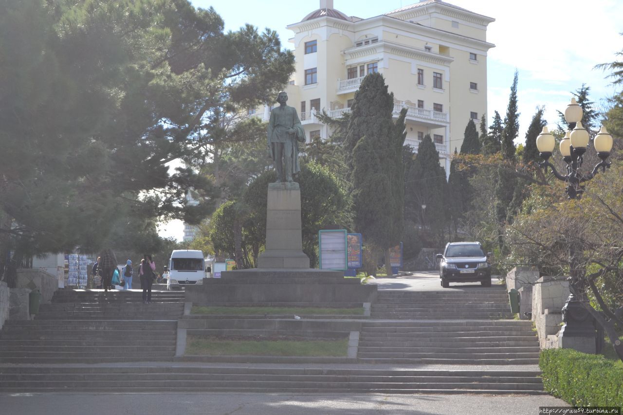 Первый раз в Ялте Горький появился в 1891 году во время своего бродяжничества по" святой Руси". В Ялте работал грузчиком в порту, чтобы заработать на пропитание. Из Ялты берегом моря Горький пешкодрапом отправился в Феодосию, затем в Керчь, где переправился через Керченский пролив в Тамань.