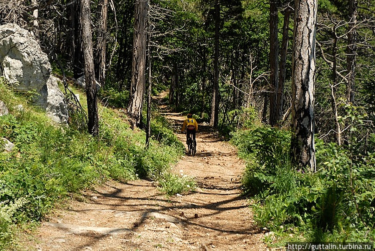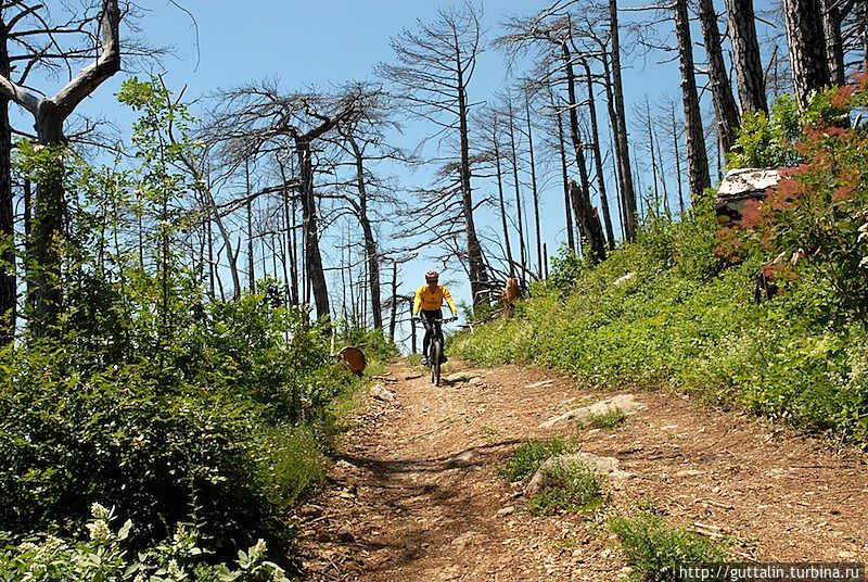 Начало спуска — крутая тропа со щебнем, далее попроще. Вот уж где я порадовался, что у меня есть нормальные тормоза и злая резина. По Жененой рекомендации сменил стоковую на Schwalbe NOBBY NIC 29" x 2.25 SnakeSkin, TL-Ready за что ему огромное спасибо. Я оценил эту покрышку. Пока дорога шла по лесу и над головой смыкались кроны сосен и буков, все было хорошо. Как только выехали на то место где был пожар, на дороге появились огромные промоины, больше напоминающие русла небольших речек. Тут то по-настоящему можно было оценить Нобика.