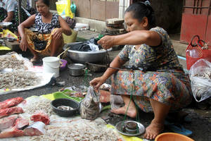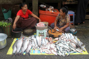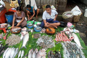 Янгон расположен на берегу реки. Но приличной набережной, по которой можно было бы прогуляться, здесь нет. Поэтому о реке быстро забываешь. Но, наткнувшись на улице на огромный рыбный рынок, сразу понимаешь - река, действительно, где-то неподалеку. Вся рыба здесь продается исключительно исключительно свежая, а не мороженная.