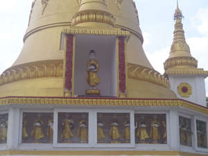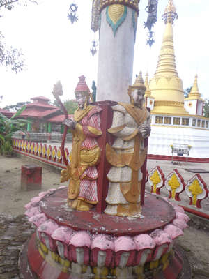 Начало у навесного моста между кварталом 50 и улицей Тху Нандар. Место совсем не туристическое, но мост приятный. Сразу после моста небольшой рынок, там я сфоткал чистильщика капусты, чем его очень удивил. После рынка квартал В 50 : монахи-бездельники просят рис, тут же гуляют коровы. Там я обнаружил школу для жителей окраин Янгона т.е. практически сельскую. Всего 2 комнаты, в первой, поменьше, учителя не было, зато сидели дети с рисунками, я сфотографировал два из них, слабовато они рисуют. Во второй комнате шло занятие, там довольно тесно, учитель сидит, скретив ноги и что-то декламирует, а школота пишет. Сильно удивил девушек за последней партой, подёргав их за косички. От школы я планировал дойти до университета Дагон, в результате, сбился с пути и попал почти в сельскую местность, где нет машин, а дороги — грунтовки. Сфотографировал местных ряженых в костюме быка и повернул обратно. На автобусе добрался до моста в южной части дороги Пинлон и посетил там академию буддизма, вход свободный, охраны нет, вода из кулеры бесплатная.
