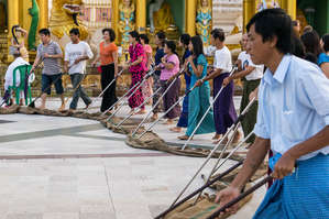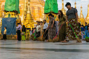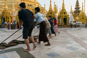 Когда моя дочка увидела мои фото на фоне Шведагона, она заявила, что срочно хочет в "волшебный золотой город" — туда, где мама. А ведь «Шве» переводится с мьянманского именно как «золотой», ну а «Дагон» в данном случае — это название местности. Мьянма вообще, как известно, страна тысячи пагод, и главная из них — Шведагон. Сюда тянутся не только многочисленные туристы, но и паломники со всей страны. При входе на территорию комплекса следует разуться. Сначала это требование, признаться, немного смущает. Брезгливость и все такое. Все-таки здесь ходит огромное количество народа. Мало ли что… Но местные жители считают так: по этой земле когда-то ступал сам Будда, ступал босым, поэтому ходить в обуви — значит осквернять святую землю. Кстати, здесь, несмотря на большое число посетителей, достаточно чисто. Ведь поддержанием чистоты каждый час занимаются добровольцы из числа прихожан. Сначала все дружно, выстроившись в линию, проходятся по кругу с метелками. Потом тем же маршрутом и так же дружно — с швабрами. Прикольный ритуал уборки!