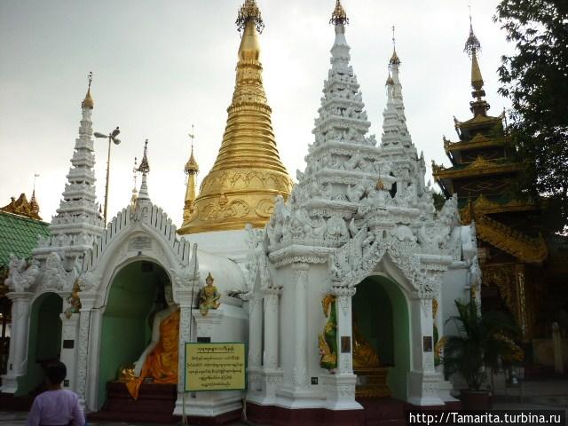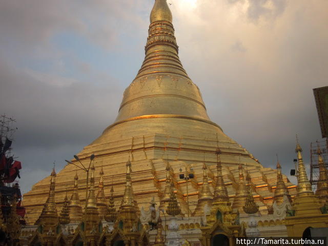 Красавица, какая красавица! Небо затянуло тучами, а она на чёрном небосводе золотом горит. Лучше восхода и лучше заката оказалось грозовое небо для сияющей ступы, на котором пропечатались её чёткие контуры. А у подножия лес из золотых ступ, размером поменьше, в каждой Будда сидит. Да и вообще Будды здесь повсюду, разных размеров и лиц. Деревья из металла в золотых колокольчиках выстроились рядами вдоль квадратного основания Шве Дагона. Местный люд молится в специально отведённых местах, выкладывая лотосом подступы к статуям и увешивая их венками.
