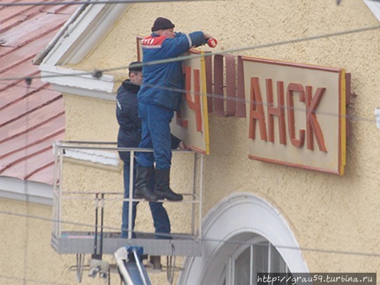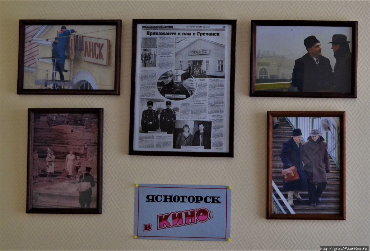 Говоря о здании железнодорожного вокзала, нельзя не упомянуть о том, как оно снималось в кино. Был один день в жизни станции Ясногорск, когда она превратилась в станцию Гречанск. На фотографии видно, как меняют вывеску с названием станции. произошло это 28 марта 2008 года. Я рассказал об этом в материале