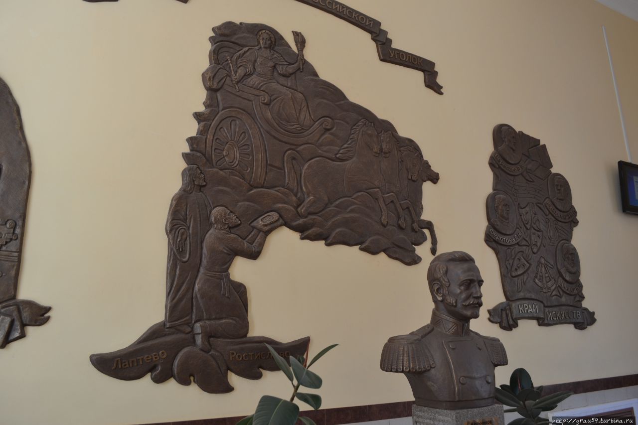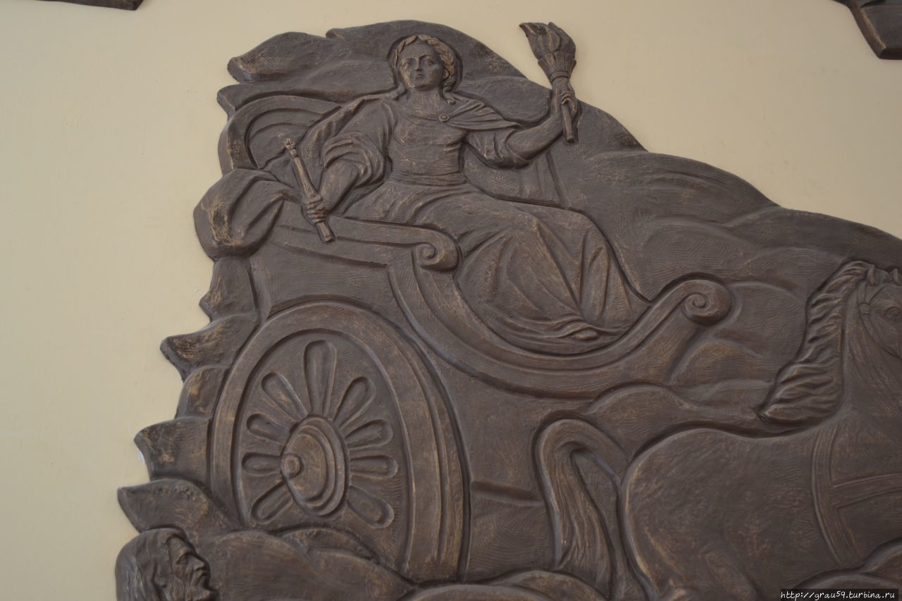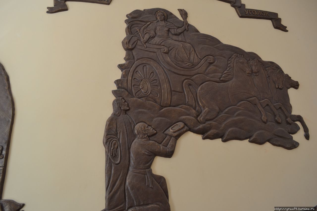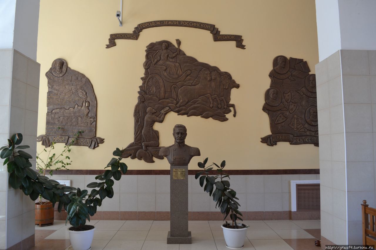 За бюстом Мельникова расположилось шикарное панно, а котором концентрированно отражена вся история Ясногорска. Состоит панно из трёх частей, своеобразный триптих.