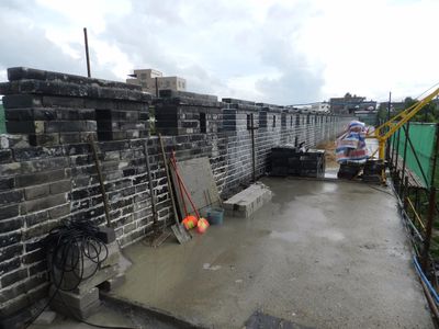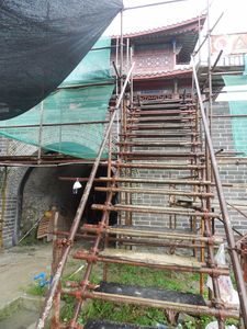 Зная любовь китайцев ко всевозможным новоделам, я усомнился в древности объекта, и потому первым делом отправился посмотреть тот проход, через который люди заходили в город.. Пришлось хлюпать по грязи, однако сомнения отпали. Я убедился, что внутренняя кладка вовсе не новодел, чего никак не скажешь о крепостной стене. От улицы стройка была огорожена забором. По всей видимости, работы по реконструкции ведутся давно.Возвращаюсь назад, чтобы подняться по строительной лестнице на крепостную стену. Ремонт здесь в самом разгаре. Дабы сфотографировать надвратный домик без строительных декораций, пришлось выискивать ракурс.