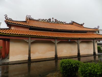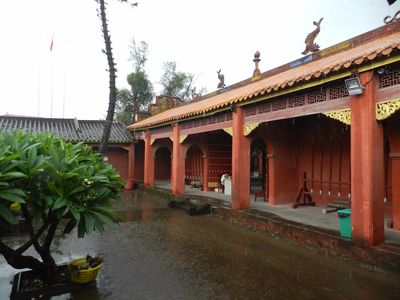 К конструкции прилагалась пустая пластиковая бутылка. Раскурив всю эту байду, он обдал дымом весь магазин. Смотрю, глаза у мужика ещё больше окосели, рот растянулся в улыбке. Китаец предложил трубку мира мне.Вежливо отказавшись, я сделал вид, что дождь уже не столь сильный, решив, что мне лучше уйти.... Иду, открыл зонт, и, где это возможно, фотографирую. По некоторым покосившимся домикам вижу, что они, если и не древние, то как минимум старые. Перескакивать через лужи пришлось не долго. Я обнаружил вход в какой-то комплекс. Никто никаких билетов покупать не заставлял. Вход был свободным. При этом сам комплекс обещал быть интересным. Дабы не мокнуть, я начал его осматривать передвигаясь по боковым галереям. Здесь можно было видеть одинокие скульптуры и медные таблички с рисунками. В качестве основных экспонатов на обозрение публики были выставлены большой барабани аналогичный колокол. Увы, о чём шла речь, не зная китайского, я не понимал. Сиё место (квадратный двор с галереями по бокам) являлось предбанником храма. Красиво оформленное в национальном стиле, оно гармонично сочетало блочную арку и горбатый мостик. Первая часть комплекса была отделена от второй воротами. Чутьё подсказало мне, чтобы я более основательно изучил первую часть. Свернув чуть вбок, я обнаружил нечто похожее на музей. Под навесом редкого посетителя ожидало множество исписанных иероглифами камней и каменных декоративных блоков, всего того, что хунвейбинам лень было громить и добивать кувалдой. От внешнего мира комплекс огораживался пусть и не высоким, но в то же время мощным забором. Вторая часть отделялась от первой воротами. Когда-то они запирались квадратным бревном. Теперь же войти можно свободно, во всяком случае днём. У входа стоял стол. За ним сидела молодая китаянка. Меня она сфотографировала, но себя запечатлеть для истории не разрешила. Как я и предполагал, передо мной был даосский храм. Я зашёл внутрь, посмотрел Богов, их алтарь, всевозможных черепах и кошек, всё то, что на простом языке называется декоративным оформлением храма.