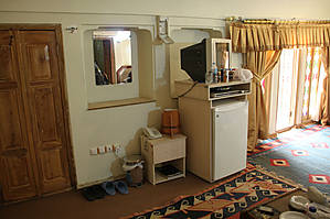 В номере две пары двустворчатых низеньких дверок. За одними — шкаф, за вторыми — нормально оборудованная ванная комната с туалетом. Полотенца, туалетные принадлежности — все в наличии.