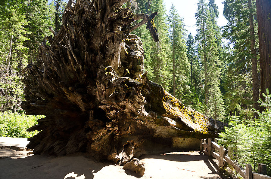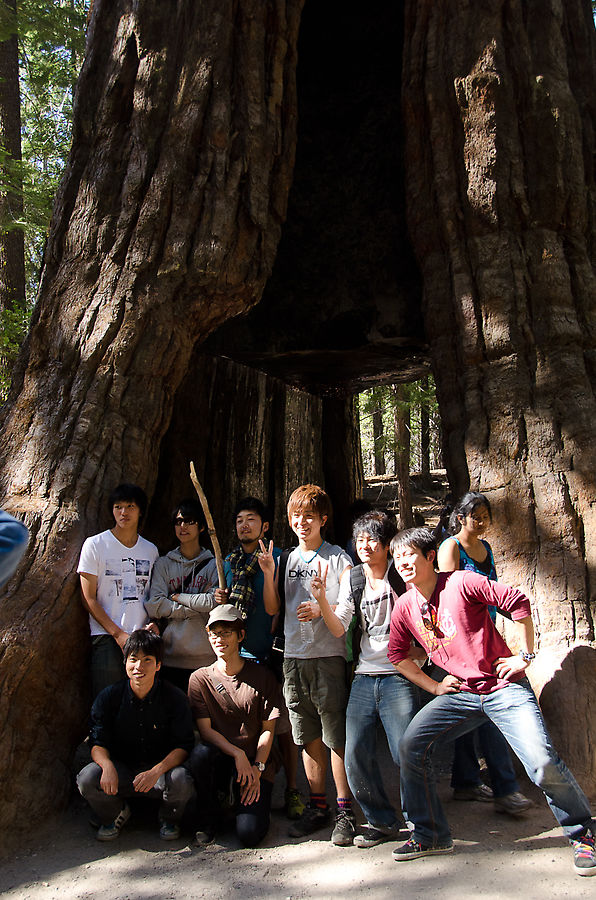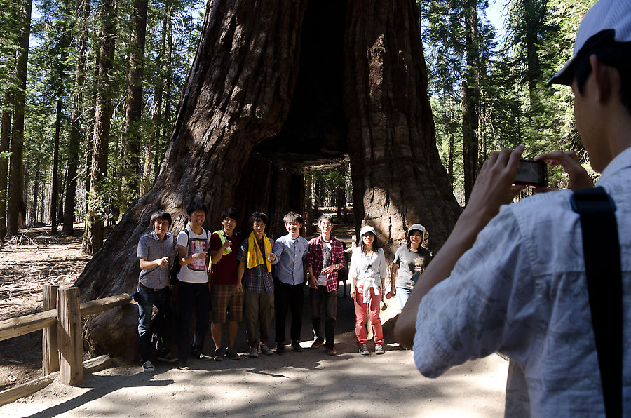 Как знает каждый умный человек, не стоит развязывать сухопутную войну в Азии и ездить в национальные парки на длинные выходные. У рощи гигантских секвой была такая очередь, что не осталось места для парковки машин, пришлось пересесть на автобус. Гигантские секвойи – это деревья, чьи ветки толще, чем ствол ели. Выше статуи Свободы и 19-этажных небоскрёбов. Когда-то леса секвой стояли по всей Калифорнии, а сейчас – это всего несколько разрозненных рощ. Они такой же реликт прошлого, как отполированный ледником камень. В 19-ом и 20-ом веке их еще не стеснялись рубить. В одном огромном дереве на потеху туристам прорубили ворота, в которые проезжал автомобиль. Дерево, конечно, быстро померло. Тогда прорубили ещё в одном. Второе дерево сумело чудом выжить и живо до сих пор. Вот у огромной раны фотографируются счастливые японские туристы.