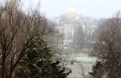 Мы выглядываем из окна отеля, Верманский сад в снегу, снежная крупа делает нечеткими очертания собора, и приглушают блеск золотых куполов. Пахнет холодом. Дыхание не испаряется, оно замерзает.