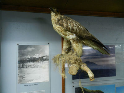 Комнатка маленькая, и, дабы что-то рассмотреть, мне пришлось ждать, когда пройдёт вся наша группа. Тем не менее сотрудники музея сумели разместить здесь: череп дельфина, рёбра кита, китовий ус, фрагменты позвоночника кита, рядом чучела водоплавающих птиц и тюленя. Кита в живой природе я ни разу не видел, но размеры его конечностей впечатляют! А вот морскую звезду мне на Кунашире показывали. И посему засушенная музейная была уже не столь интересна.Третий зал посвящён русско-японской дружбе.