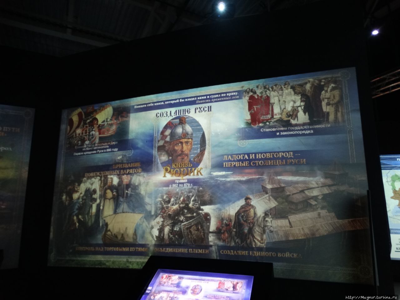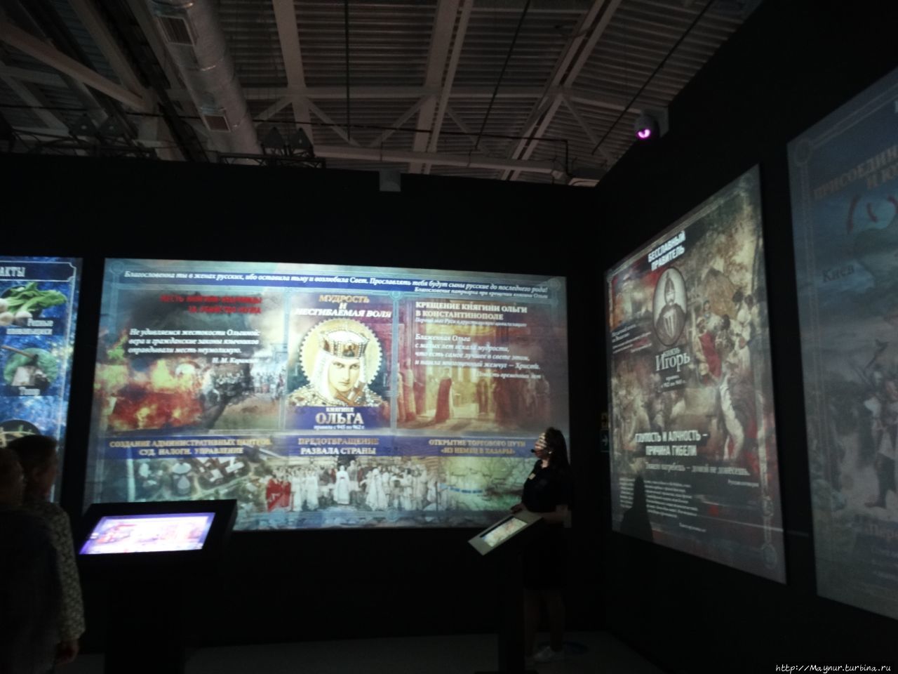 В круглом смотровом зале не куполе демонстрируются цветные фильмы о становлении Руси.