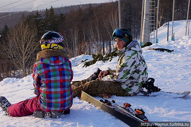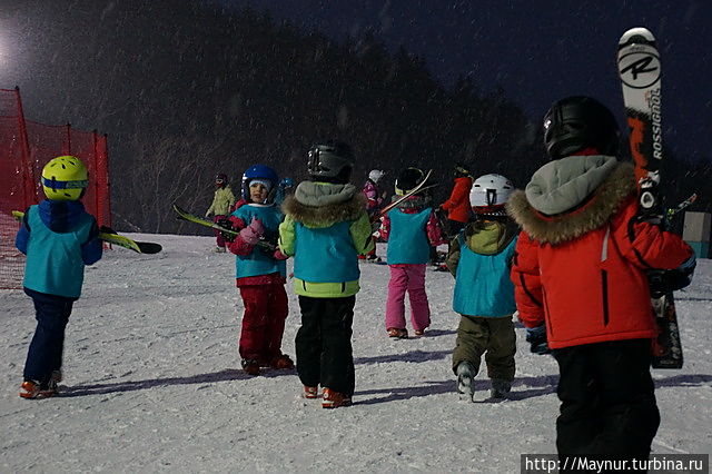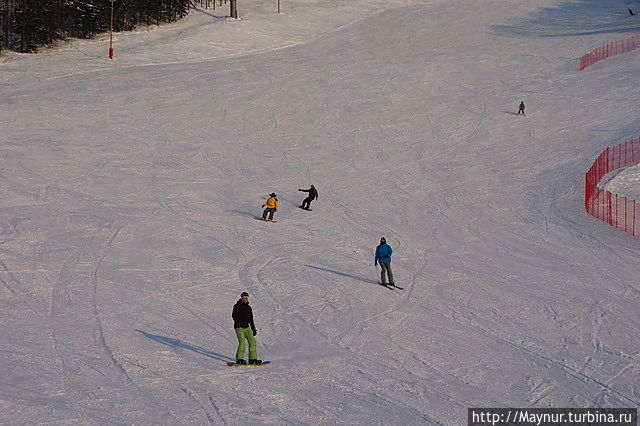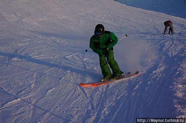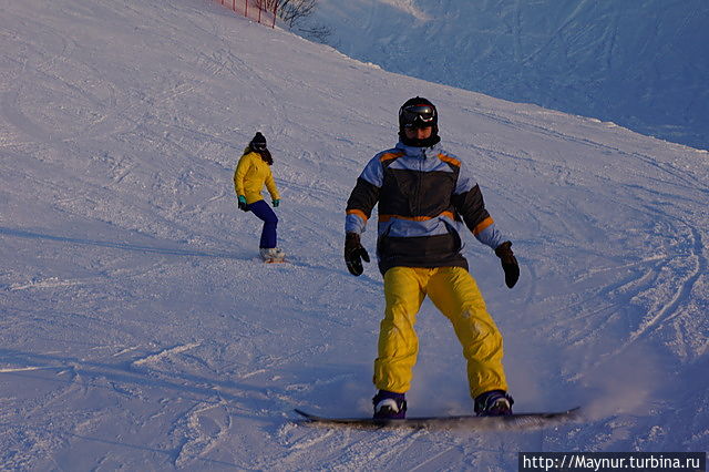 Вечером на склонах гораздо оживленее , чем днем.