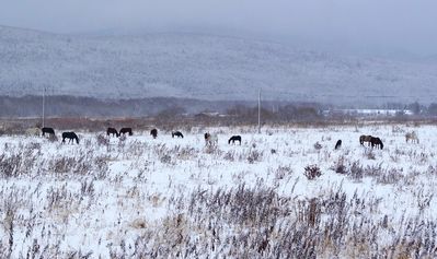 Теплая погода побаловала всех. Даже лошади пасутся на "лугу".