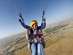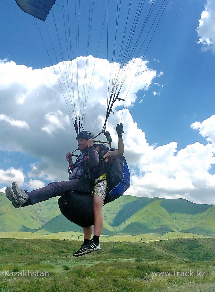 Выезжаем из города утром и едем в западном направлении вдоль хребта гор Заилийского Алатау. Около часа езды по неширокой дороге и поворачиваем в ущелье называемое Ушконыр. По серпантину заезжаем на очередную «террасу». Высота -800 метров над местом посадки Отсюда мы будем совершать наш полет. Погода сегодня замечательная, степь просматривается до самого горизонта. Несмотря на раннее утро в небе, разноцветными лоскуточками уже парят несколько парапланов. После распаковки и подготовки снаряжения проходим «крайний» инструктаж. Здесь перед самым «подъемом» все слушают особенно внимательно, вопросы не по делу никто не задает. Снова щекотливое чувство приближающегося полета. И вот первая пара уже отрывается от земли и крыло уверенно движется по воздушному бассейну. С земли инструктор, по рации держит связь с пилотом, справляется о самочувствии пассажира, но по радостным междометиям и так ясно, что пассажир в восторге. Те, кто остался на земле, ждать своей очереди в полет, заметно оживились и обрадовались успешному взлету сегодняшних «пионеров».