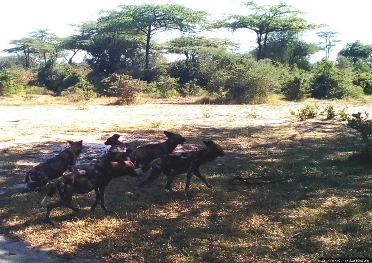 Собаки — странные, пятнистые – гиены? – Нет, это гиеновые собаки, абсолютно одинаковые. У одной из них вся пасть в крови, кем-то уже поживились, теперь отдыхают в тени.