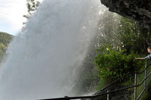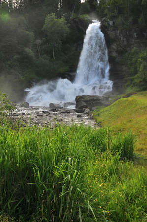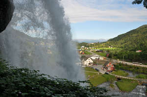 Это весьма примечательный водопад — Steinsdalsfossen (Стейндальсфоссен). Его ложе покоится на скальном выступе, благодаря чему вода не стекает по горной круче, а срывается с выступа на изрядном удалении от склона – образуется ниша, внутри которой идет огороженная тропа с мостками – можно взглянуть не только на сам водопад «снаружи», но и оказаться за водяным грохочущим занавесом — «внутри» водопада.