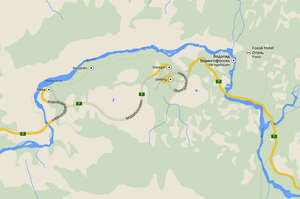 Далее шоссе начинает спускаться с высокогорья в долину. Мы знали, что спуск будет крут и извилист. Однако реальность превзошла наши ожидания. На приведенной карте видно, что дорога ныряет в череду тоннелей, пробитых спиралями внутри горы – один виток каменной спирали над другим. Спуск был захватывающим – пришлось буквально вкручиваться вместе с тоннелем в гору. Наконец, выныриваем внизу в долине и осознаем, что такой спуск сэкономил нам массу времени, а заодно и взбодрил.