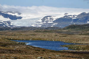 В глубине Хардангервидда весьма сильное впечатление производит внушительный и необычный вид ледника Хардангерьёкюлен (Hardangerjøkulen). Посреди обширного плоскогорья высится гора Хортейген, с которой по широкому ущелью сползает громадный язык голубого льда. Ледник удален от шоссе примерно на 10-15 км, но его прекрасно видно с дороги – настолько он огромен. К тому же нам повезло — была ясная солнечная погода. Координаты одной из видовых площадок на шоссе 7: широта 60.390621 долгота 7.596302.