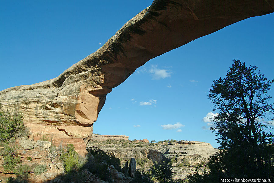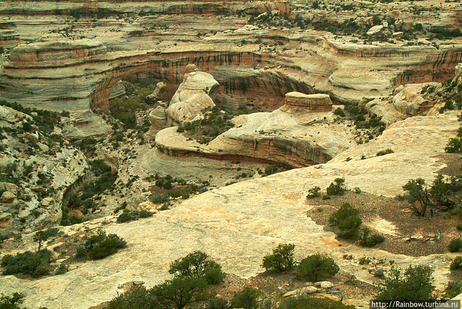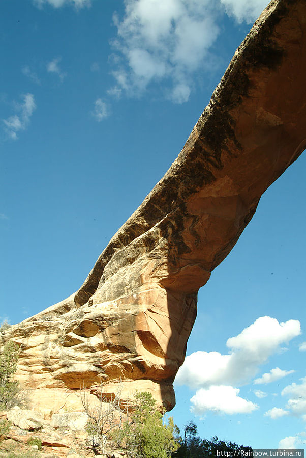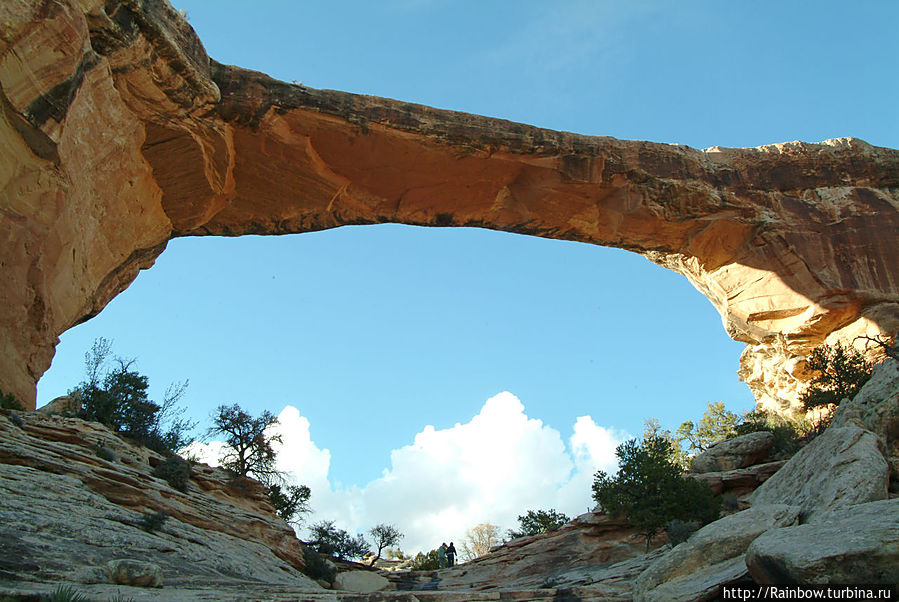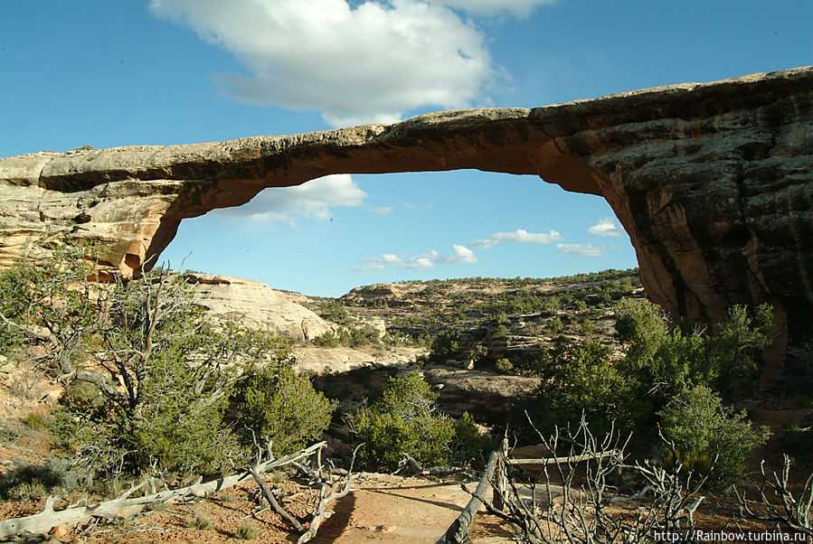 лежит этот удивительный заповедник. Попасть в него можно по горному серпантину, виляющему среди местных холмов, из обзорных площадок рассматривая творения бескрайней фантазии Создателя.Парк этот небольшой, и его основной ценностью являются три природных моста. Мосты для непосвящённого очень схожи с арками, но у них есть одно существенное различие. Природные арки более часто встречаются в природе, потому что они образуются в результате длительного действия ветра, осадков и эрозии. Природные мосты образуются иначе. Даже по их названию понятно, что их образует река. Река, которая за много тысячелетий пробивает отверстие в скале на своём пути. Тут уместно вспомнить поговорку "вода камень точит". Мосты, возникшие в результате действия реки, не так распространены в природе, как арки, а в этом заповеднике их сразу три. Свои названия "Kachina," "Owachomo" и "Sipapu" они получили в честь индейцев, для которых когда-то эти места были их домом.