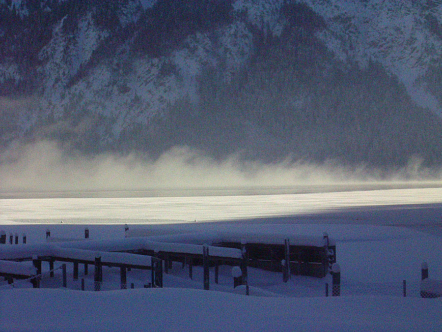 Дорога шла вдоль берега и мы некоторое время наслаждались картиной парящего на морозе озера.