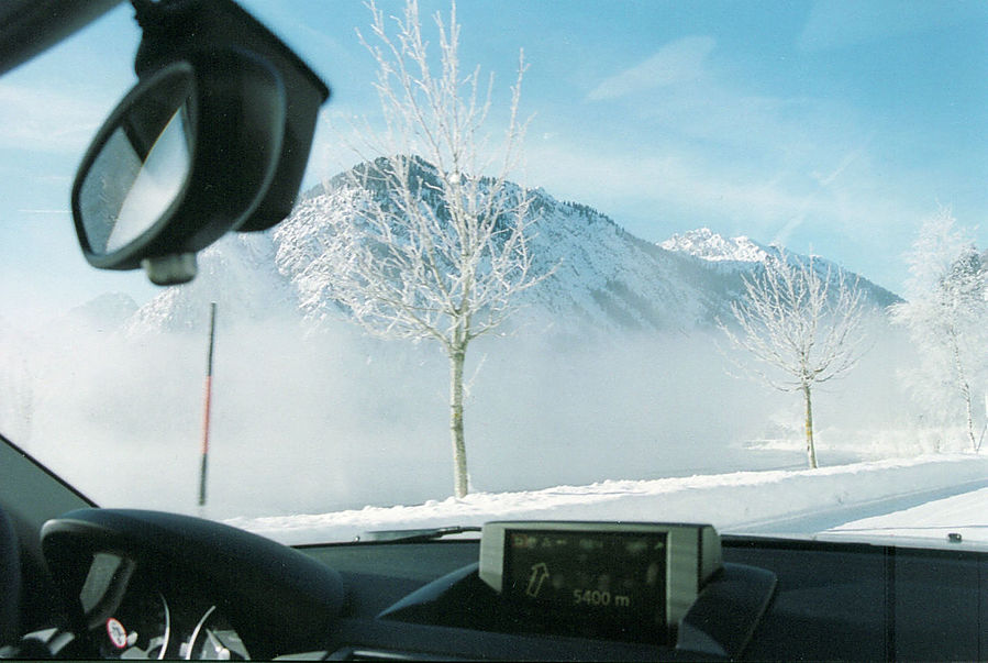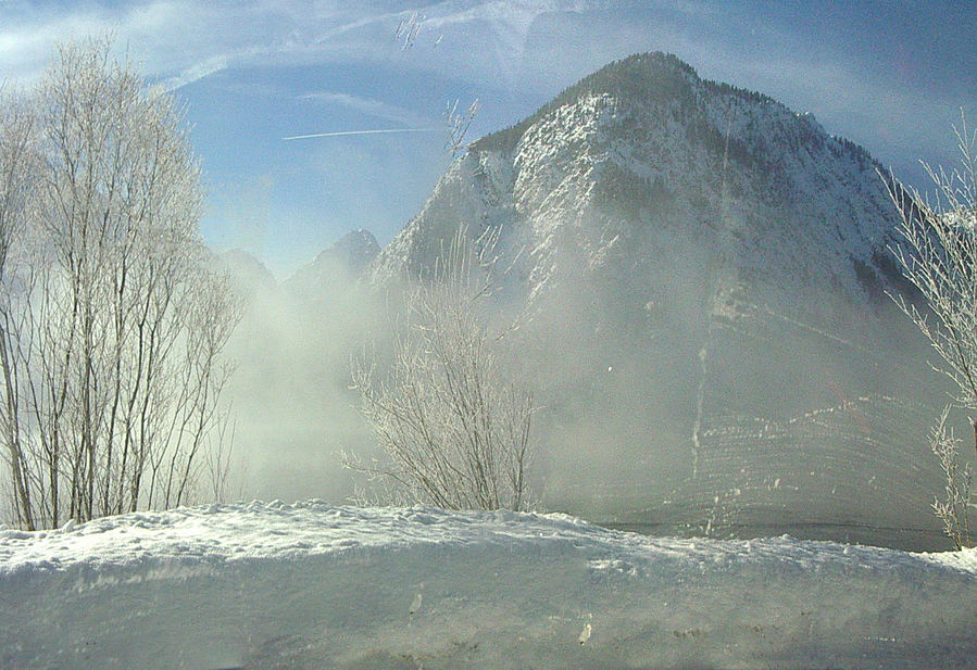 Продолжив путь по навигатору в сторону Нойшванштайна, поднялись в горы и вдруг за деревьями показалась некая завеса то ли из пара, то ли из дыма.