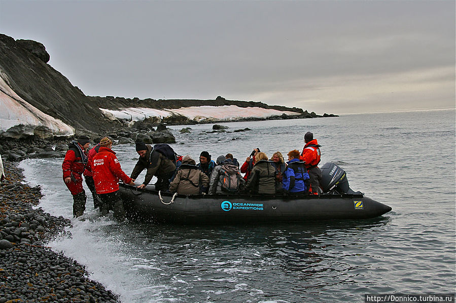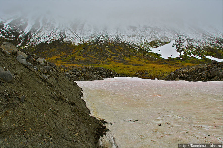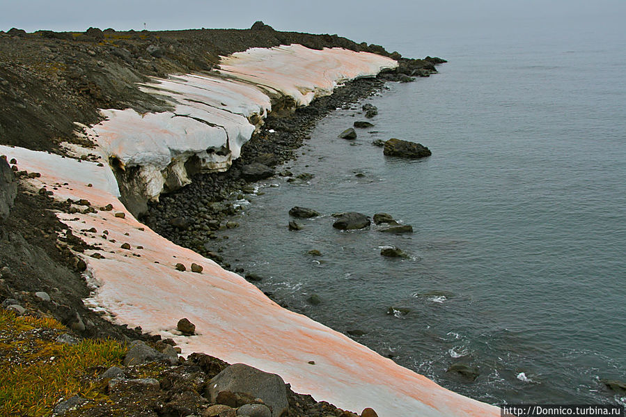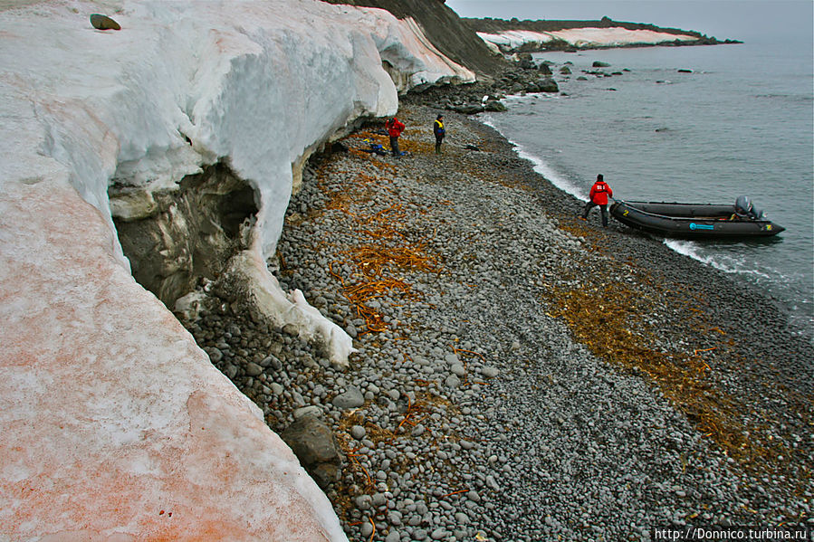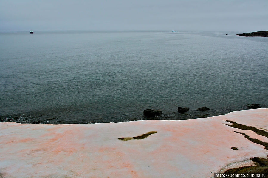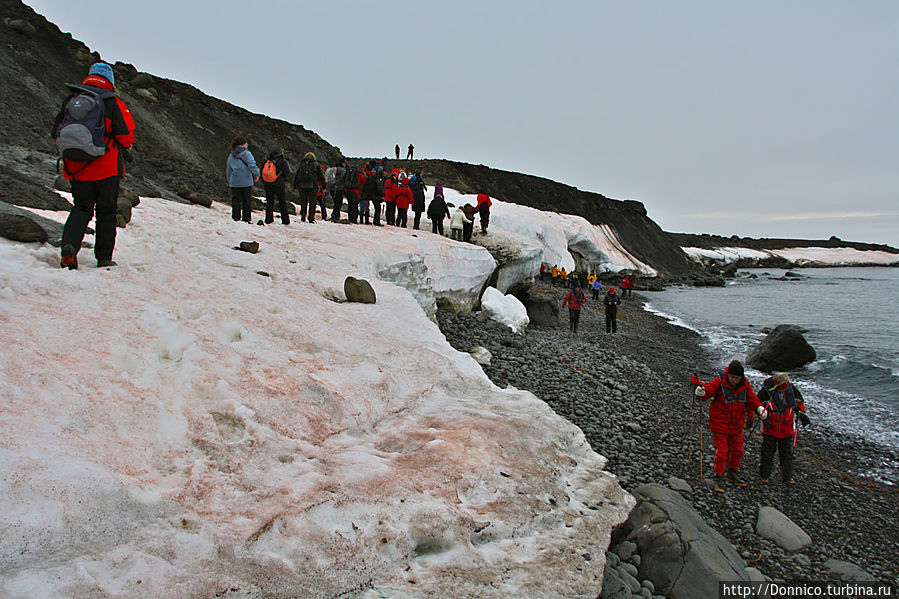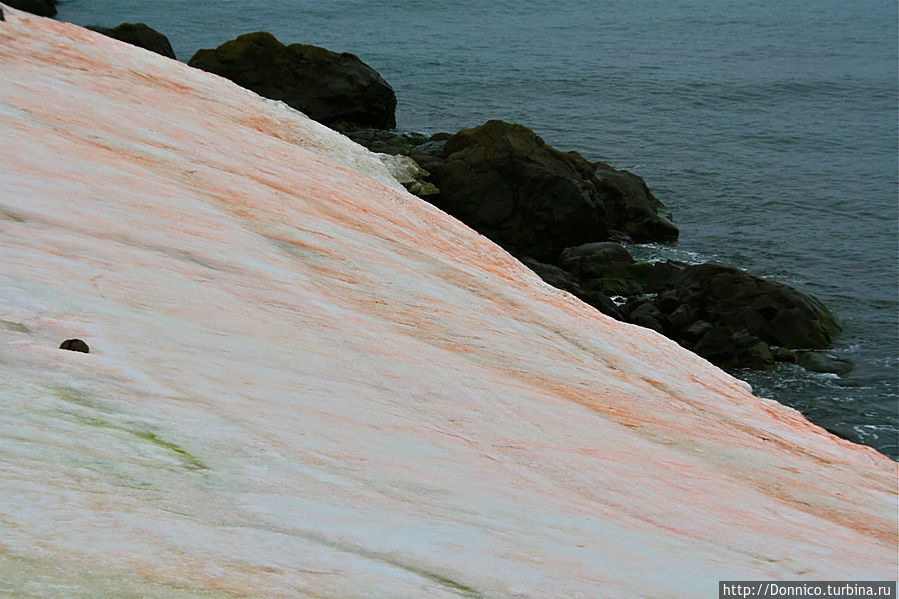 Тем временем все люди уже сошли на берег, и мы двинулись вглубь мыса Флора. Сначала надо было подняться на высокий снежный берег, имеющий по всей длине выраженный розовый оттенок. Такой оттенок снега вообще свойственен полярным областям как в арктике так и антарктике, и означает что в этих нетающих летом пластах снега поселились примитивные водоросли и микроорганизмы. Поэтому те, кто считает, что вся арктика черно-белая сильно заблуждается — она и розовая и зеленая тоже!