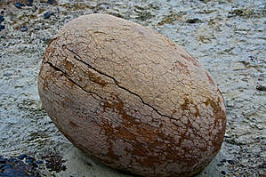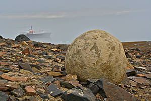 По последней существующей версии, которую нам озвучил Франц — штатный геолог на нашем корабле, в основе большинства этих сферолитов лежит органическое ядро, принадлежащее ранее какому-нибудь ископаемому округлой формы, например моллюску. Считается, что большинство отложений на ЗФИ принадлежит к верхнему Юрскому периоду, когда этот участок земной коры находился на дне океана и дрейфовал где-то совсем в иных широтах. А вот как вылупляются наши шарики из менее плотной породы: