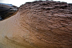 На первый взгляд такой камень состоит из плотного песчаника. Также кажется вполне логичной мысль, что после спрессовки в осадочных породах под землей он постепенно вышел на поверхность благодаря поднятию коры и постепенно давление его выдавило из склона на поверхность. После чего он просто скатился благодаря своей шаровидной форме вниз по относительно пологому склону и здесь остановился. Это — то, что подсказывает логика — но почему именно шар? Для ответа на этот вопрос карабкаемся наверх в поисках нового материала.