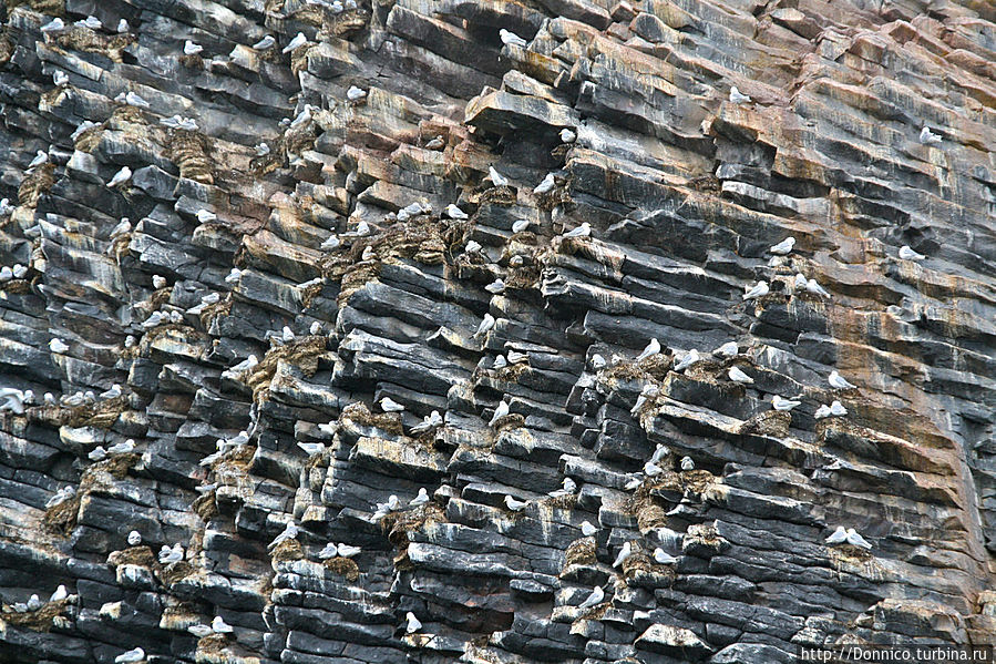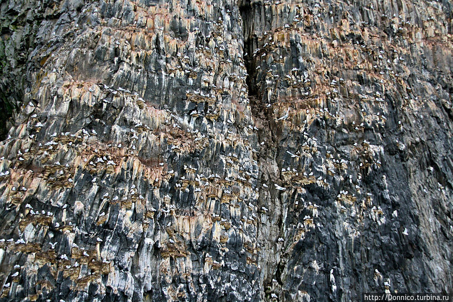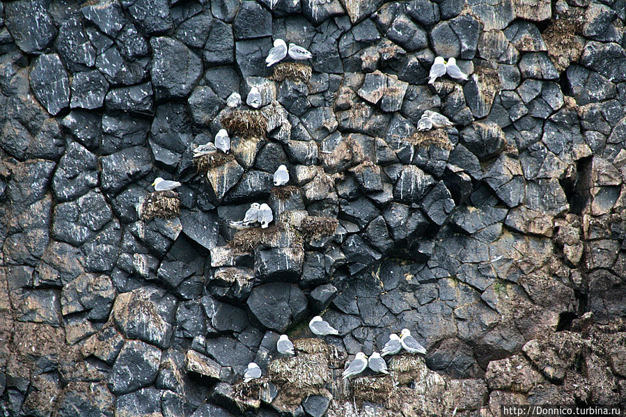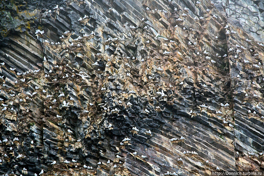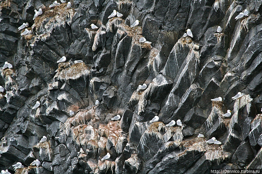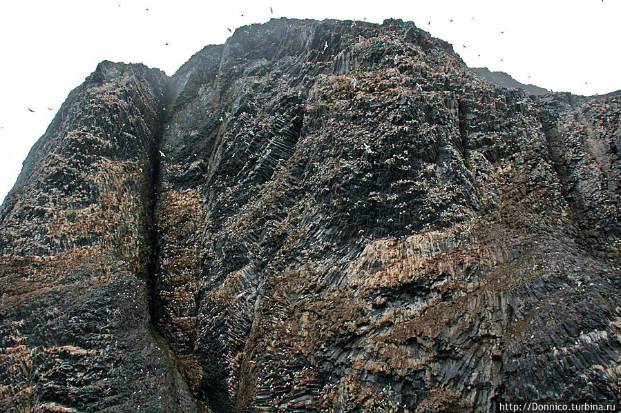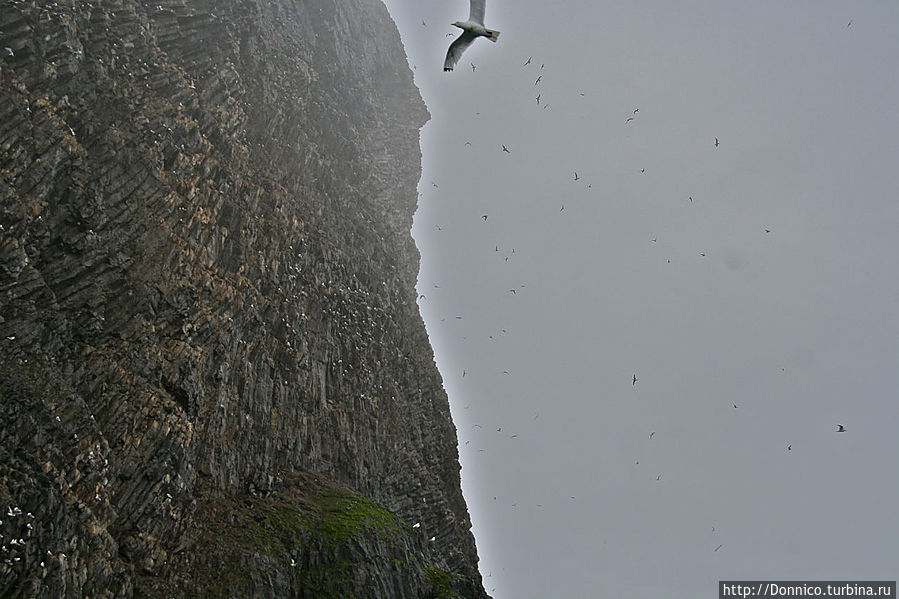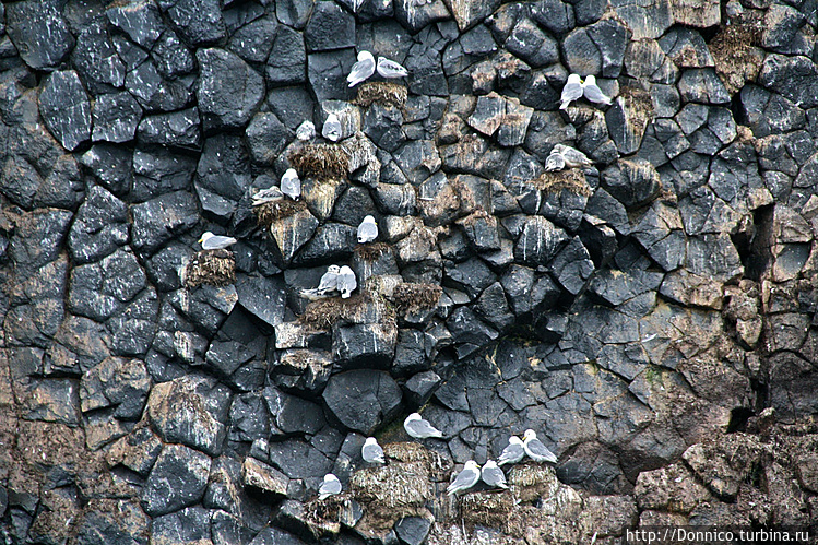 Мы таковых не наблюдали и все обитатели казалось мирно занимались своими обычными делами. Наше присутствие рядом их совсем не беспокоило. Скала со своими структурированными базальтовыми уступами дает им жилье и безопасность, два непременных атрибута птичьей жизни, а крылья и океан в непосредственной близости, неисчерпаемый источник сил и здоровья. А больше ничего и не нужно, никаких социальных амбиций и никакого прогресса. Все идет своим чередом...