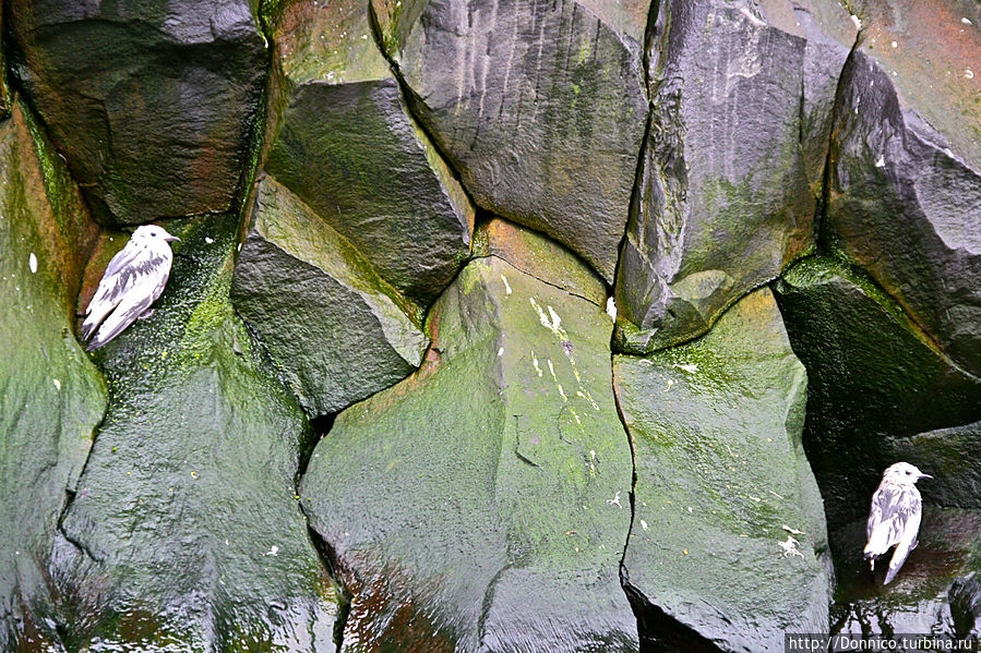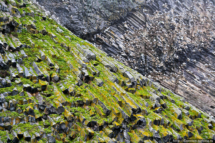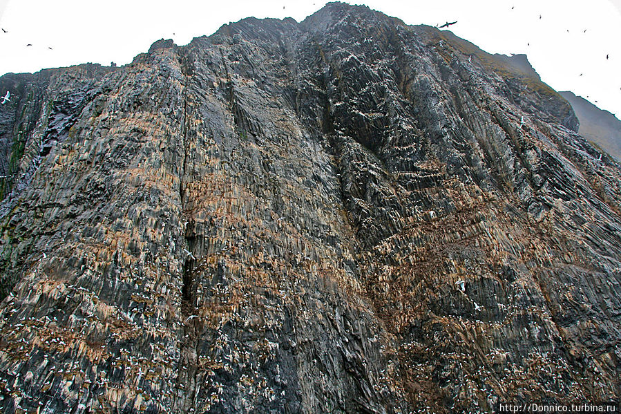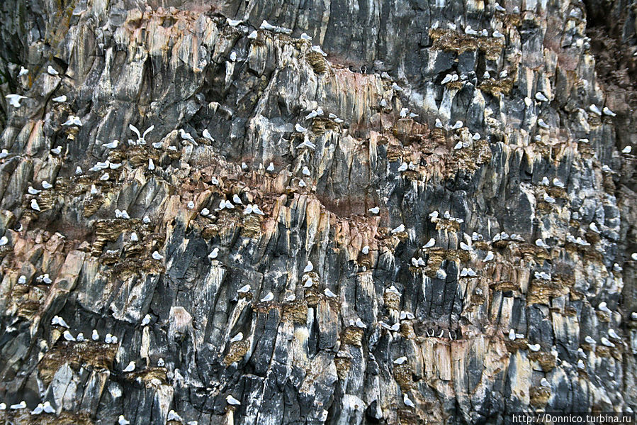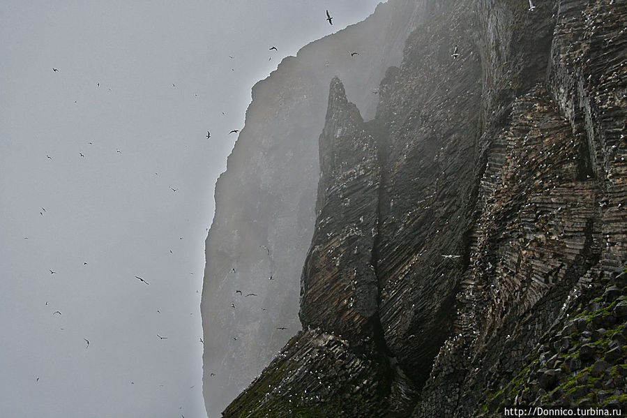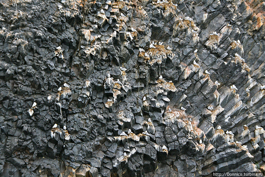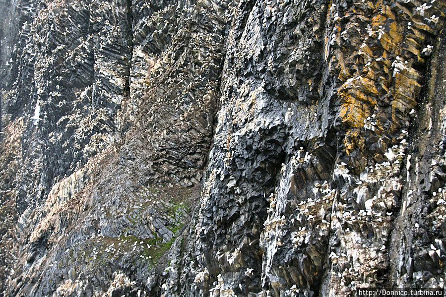 Мы таковых не наблюдали и все обитатели казалось мирно занимались своими обычными делами. Наше присутствие рядом их совсем не беспокоило. Скала со своими структурированными базальтовыми уступами дает им жилье и безопасность, два непременных атрибута птичьей жизни, а крылья и океан в непосредственной близости, неисчерпаемый источник сил и здоровья. А больше ничего и не нужно, никаких социальных амбиций и никакого прогресса. Все идет своим чередом...