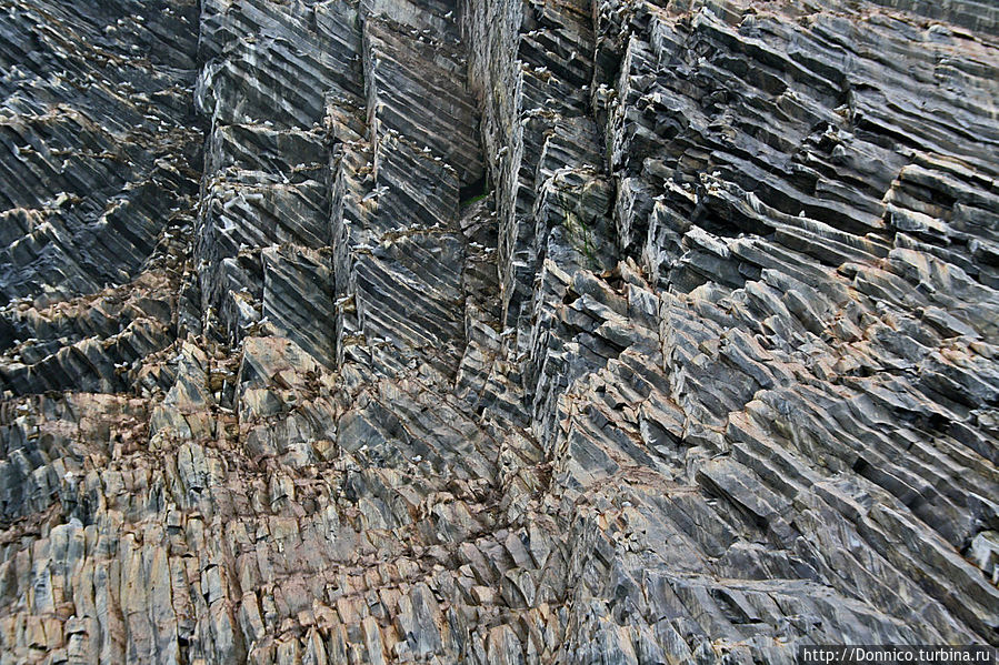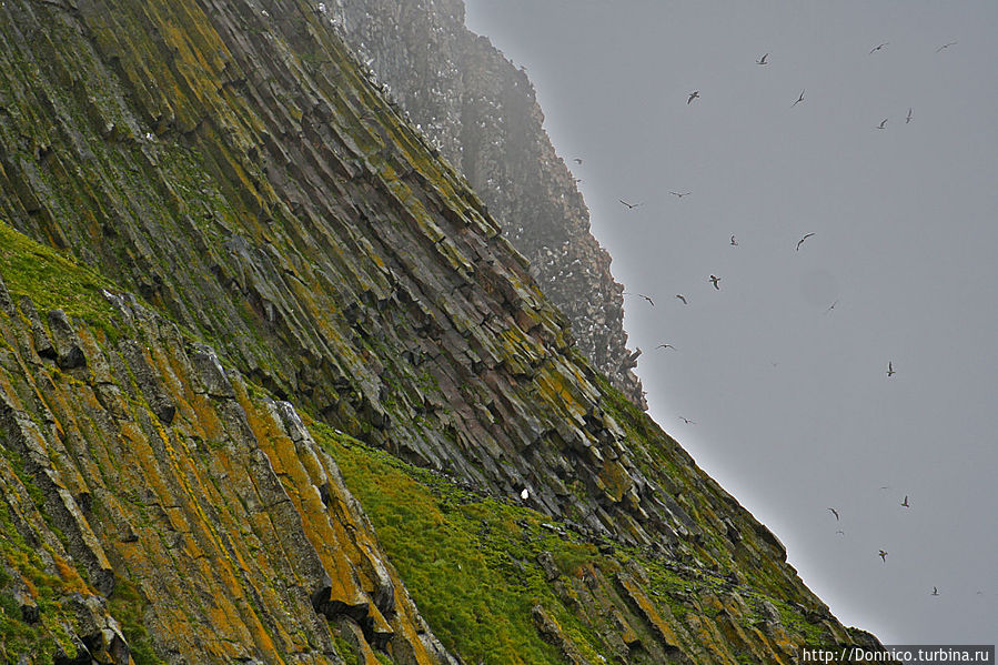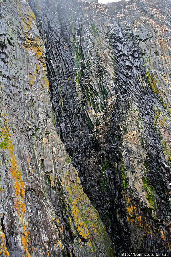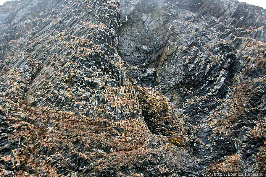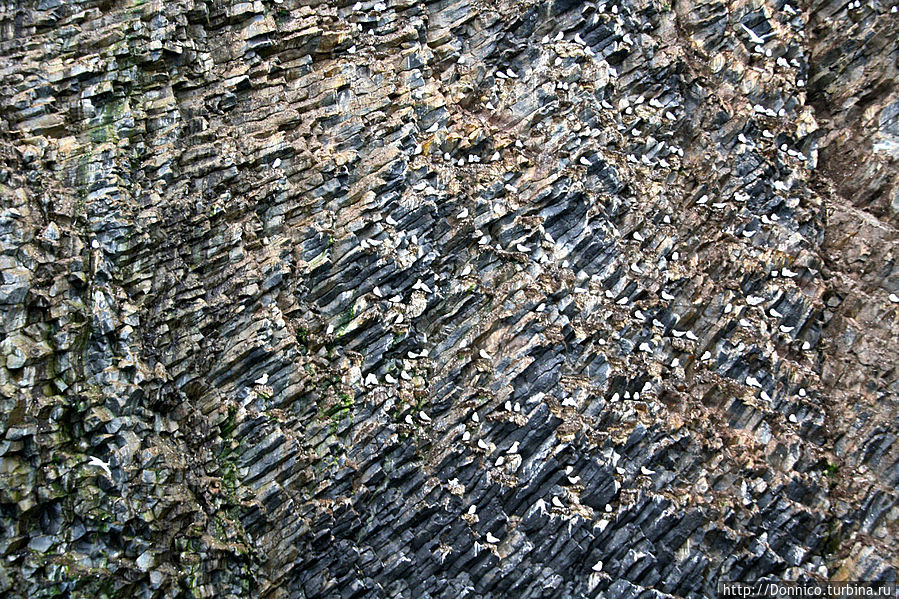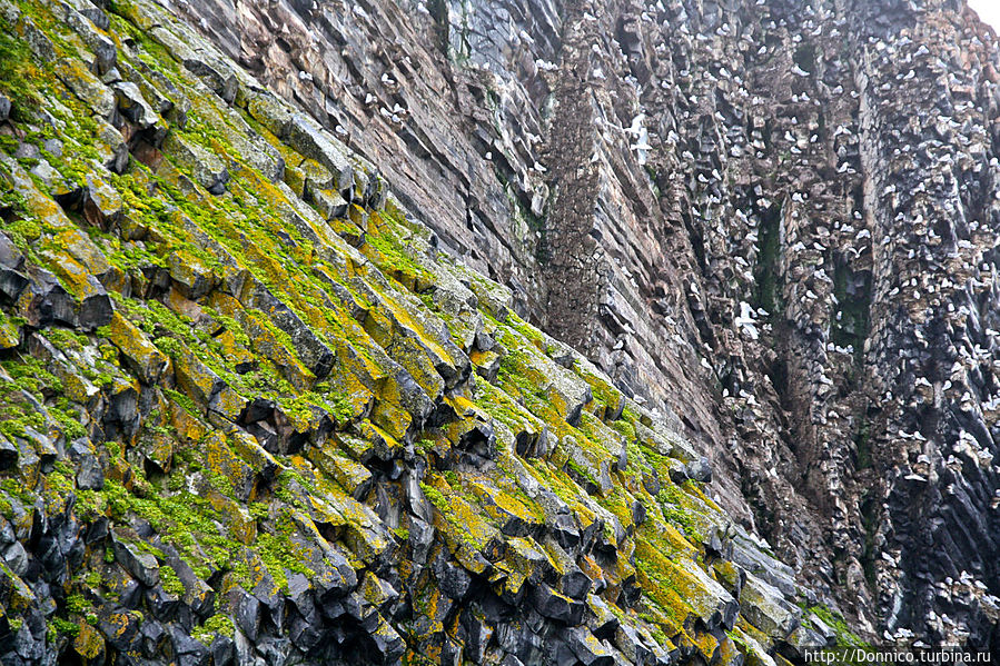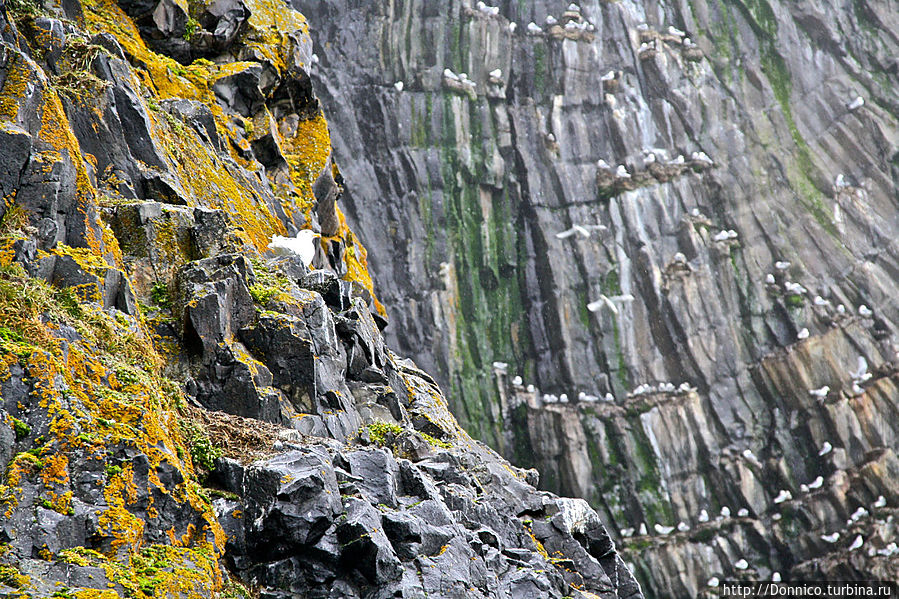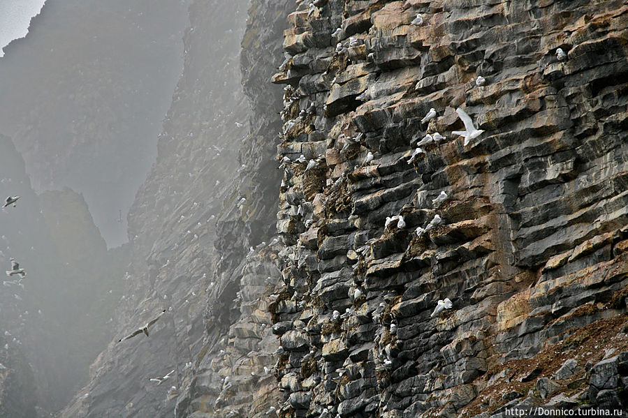 Мы таковых не наблюдали и все обитатели казалось мирно занимались своими обычными делами. Наше присутствие рядом их совсем не беспокоило. Скала со своими структурированными базальтовыми уступами дает им жилье и безопасность, два непременных атрибута птичьей жизни, а крылья и океан в непосредственной близости, неисчерпаемый источник сил и здоровья. А больше ничего и не нужно, никаких социальных амбиций и никакого прогресса. Все идет своим чередом...