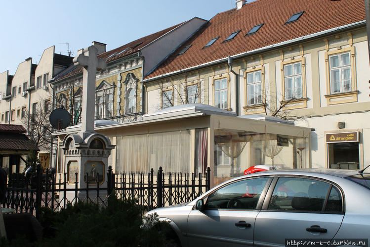 На площади Велики в этот солнечный день посетителей рынка радовал фонтан, который использовался по прямому назначению для мытья фруктов. Вкусив весенней клубники, обратим внимание на крест, на соседней площади Magistratskih. Это подарок сербским братьям и сестрам местным рантье Lazara Uroševića. А на площади Велики стоит приходская церковь Пресвятой Девы Марии, построенная в 1785 году на месте мечети. На церкви можно увидеть памятную доску, установленную в 1925 году в честь тысячелетия Хорватского Государства.
