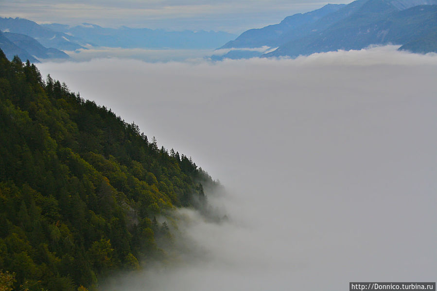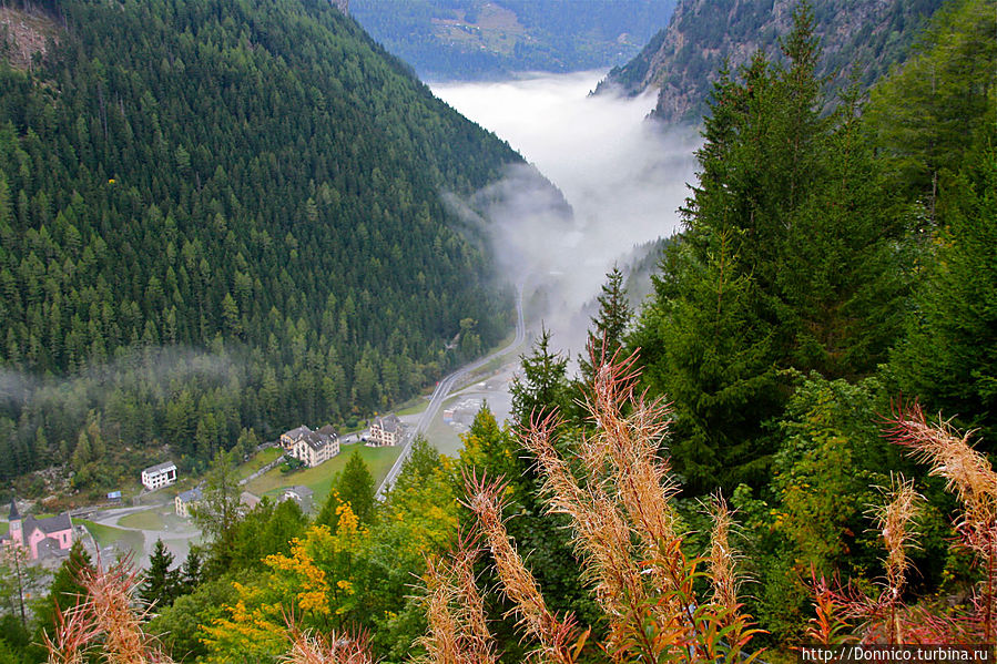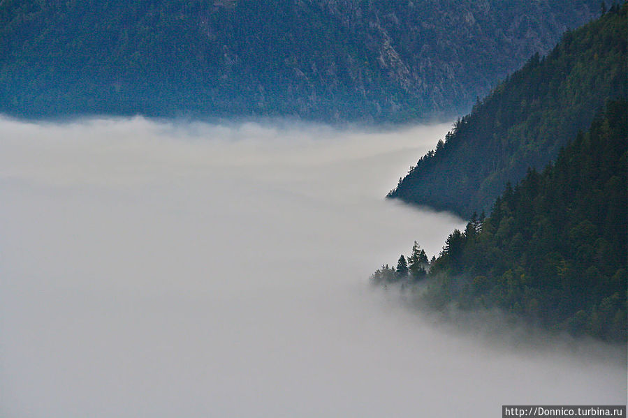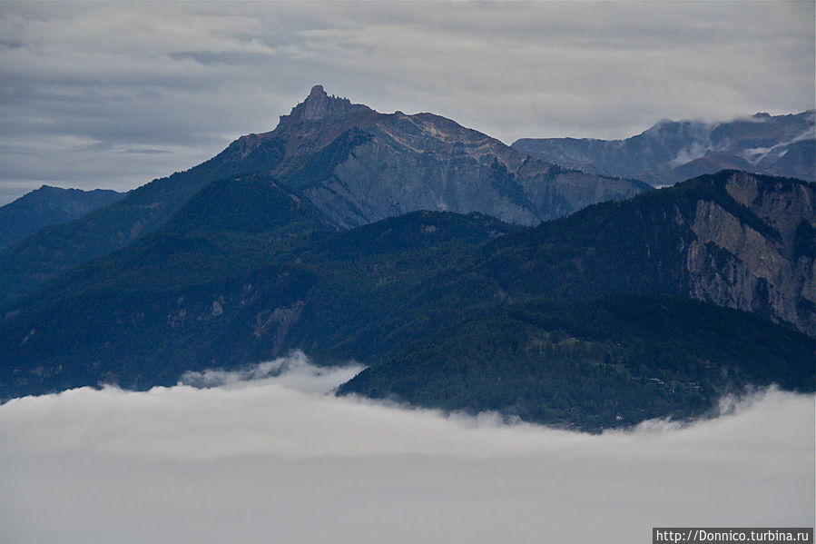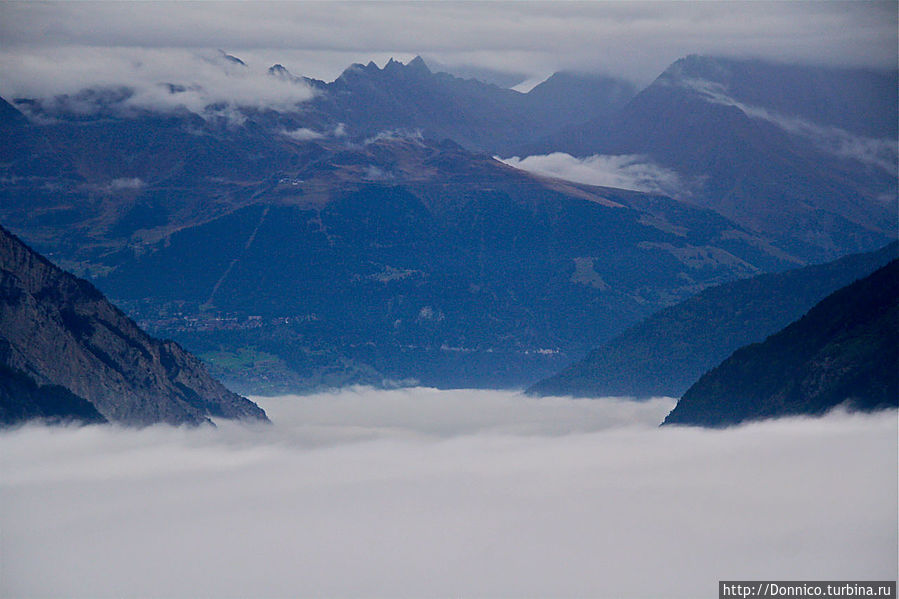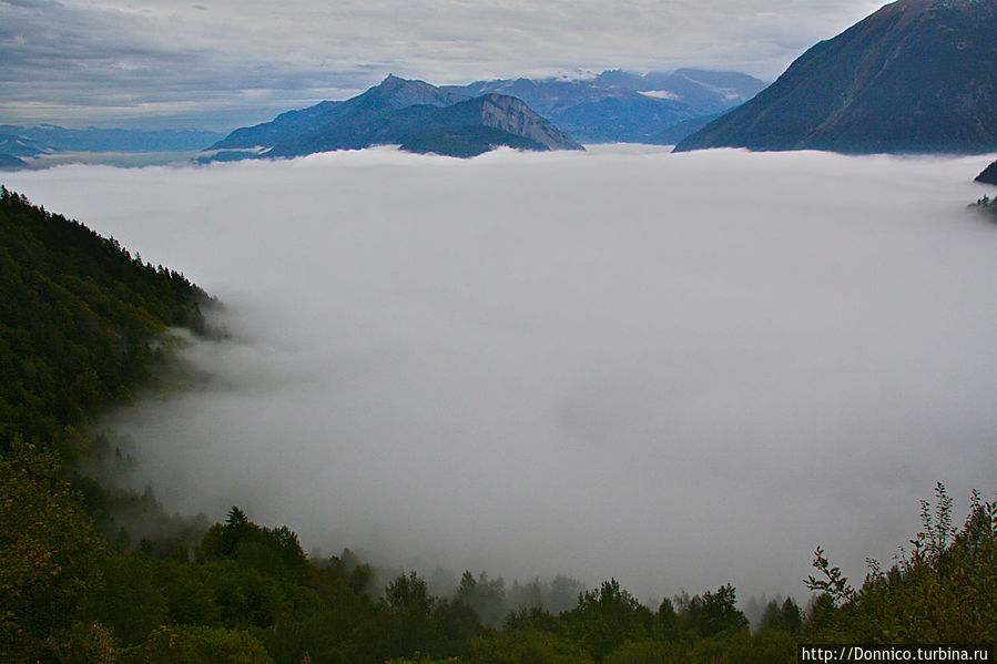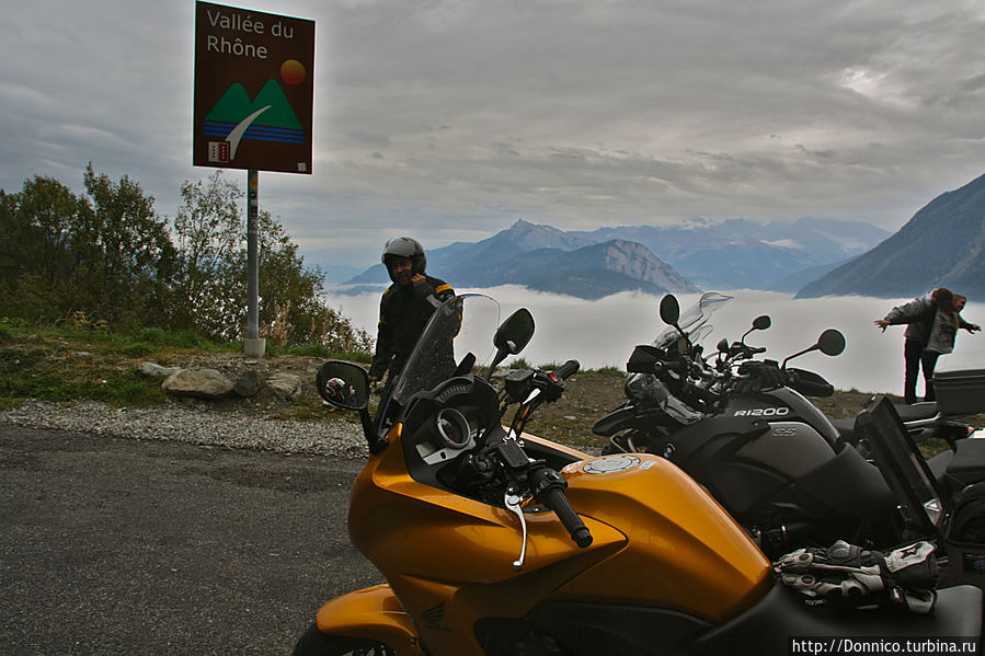 Примерно на трети пути на Форкла густой туман, в котором были видны разве что красные огоньки ехавшего в трех метрах впереди мотоцикла, наконец рассеялся и мы остановились на одной из видовых площадок, чтобы взглянуть сверху на долину Роны. Саму долину конечно не было видно, ее закрывало плотное море белого тумана, но выше его берегов все горы были отлично видны.
